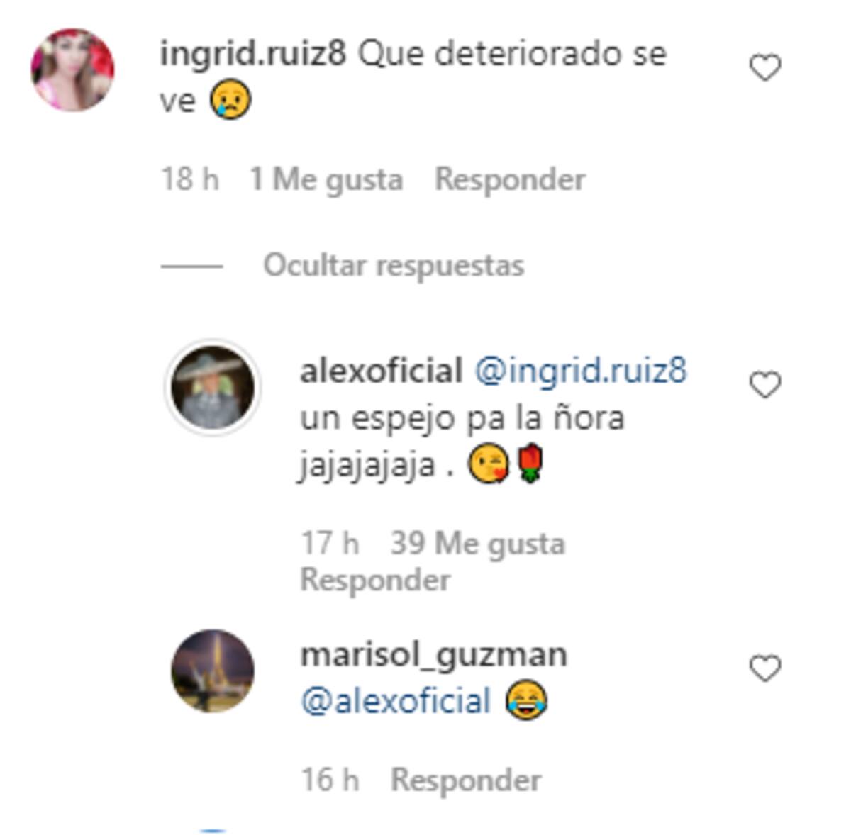 Pero el que más llamó la atención fue el de una usuaria que le dijo que se veía "deteriorado", algo que Alejandro no pudo soportar, pues fue uno de los pocos comentarios que decidió responder, con lo que parece ser demasiada molestía. Y es que el intérprete de "Te olvidé" le contestó: "Un espejo pa' la ñora", lo que desató varias burlas hacia la internauta.