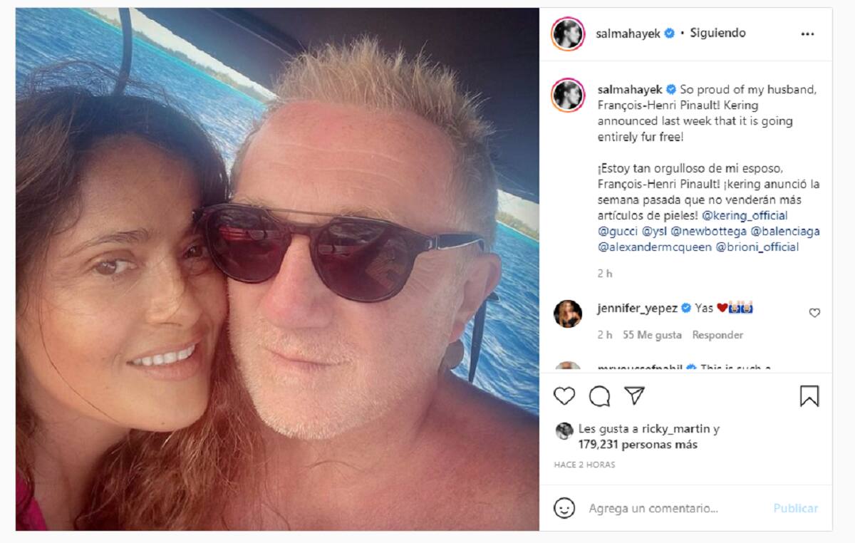 Salma Hayek orgullosa de François-Henri Pinault tras anunciar que sus firmas dejarán de utilizar pieles
