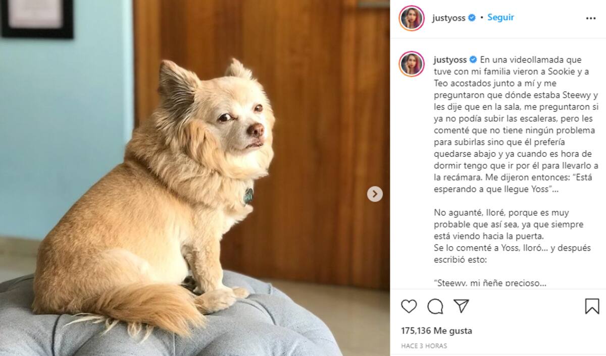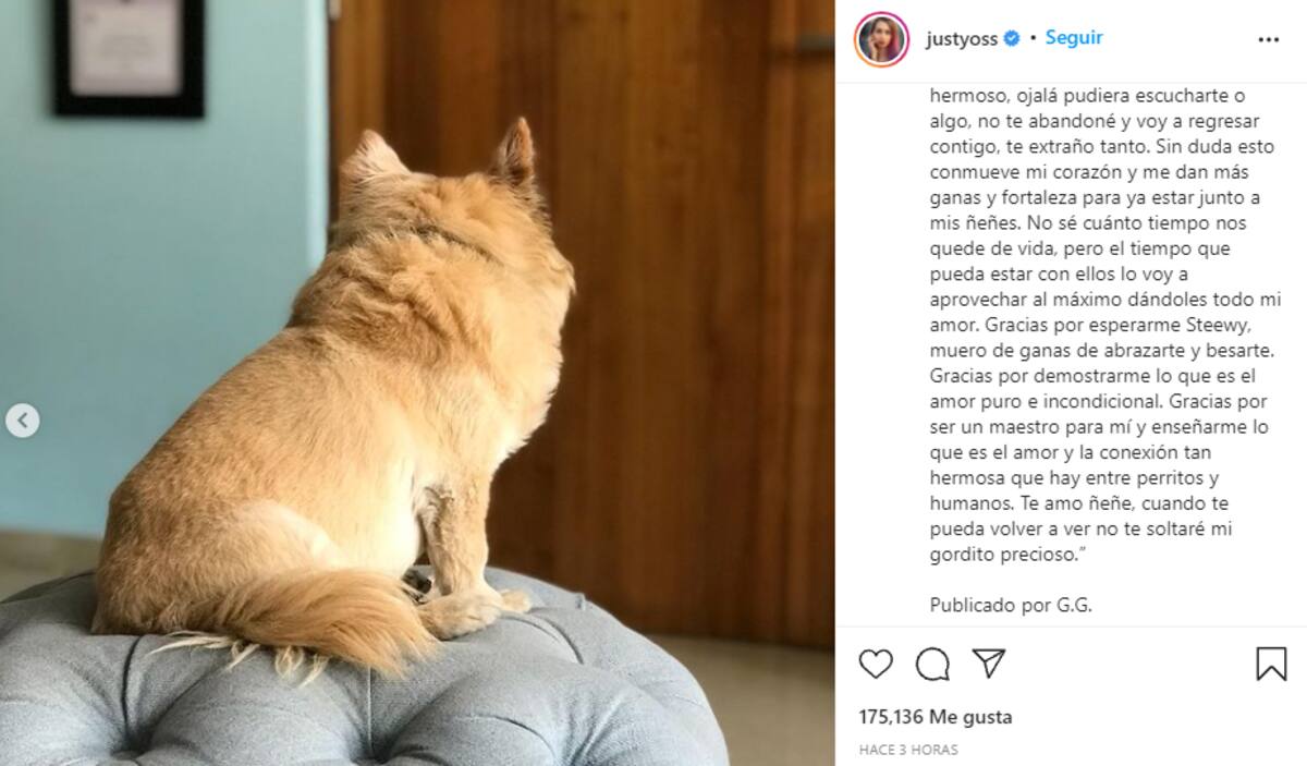 En el momento en el que Gerardo me contó como Steewy se queda esperándome todos los días y noches en el taburete azul de la sala viendo hacia la puerta rompí en lágrimas, mi ñeñe hermoso, mi primer perrijo, la conexión que tenemos desde hace más de 11 años es increíble y el amor puro y leal que sentimos recíprocamente es INMENSO. Obvio me acordé de 'Hachiko'", escribió la influencer.