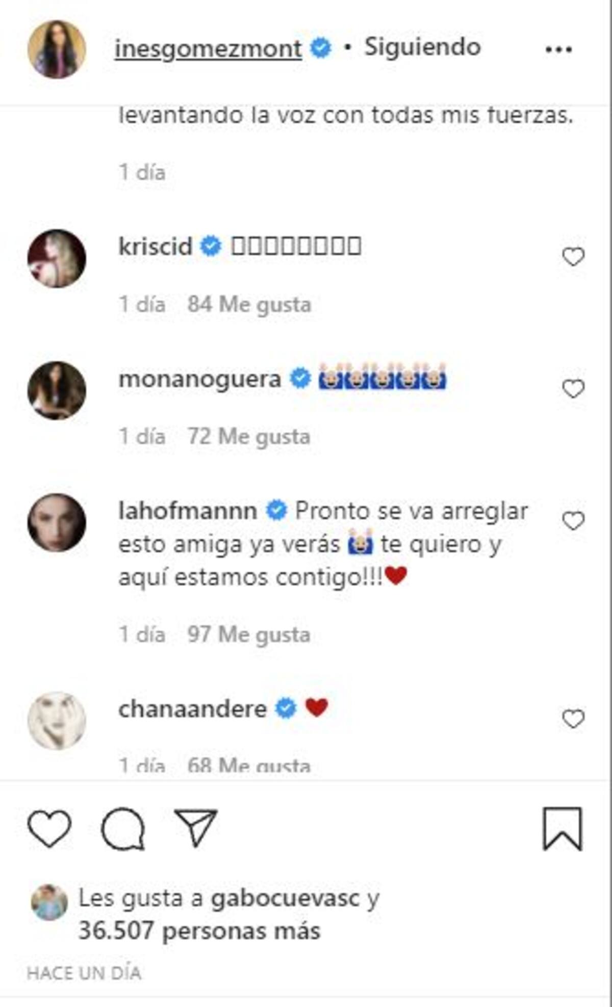 Al menos cuatro celebridades fueron las que se manifestaron en la publicación de Inés y son Kristal Cid, Mónica Noguera, Chantal Andere y Heydee Hofmann, quienes han estado muy cerca de su vida y demostraron que están juntas en las buenas y en las malas.
