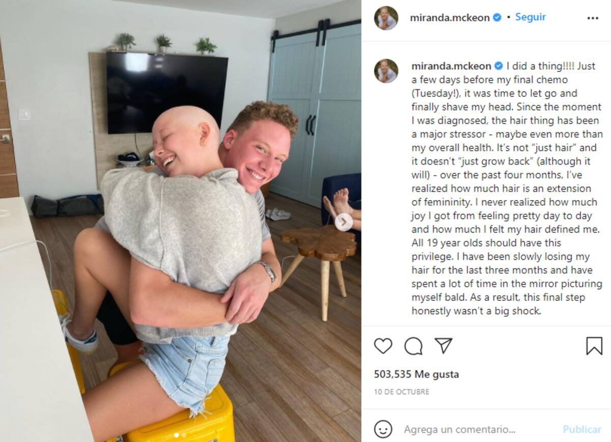 Por ejemplo, el pasado 10 de octubre, Miranda subió una fotografía a Instagram donde aparecía rapada, y reveló que decidió cortar completamente su cabello para su última quimioterapia, además de explicar que desde que fue diagnosticada, el tema del cabello era un gran peso para ella.