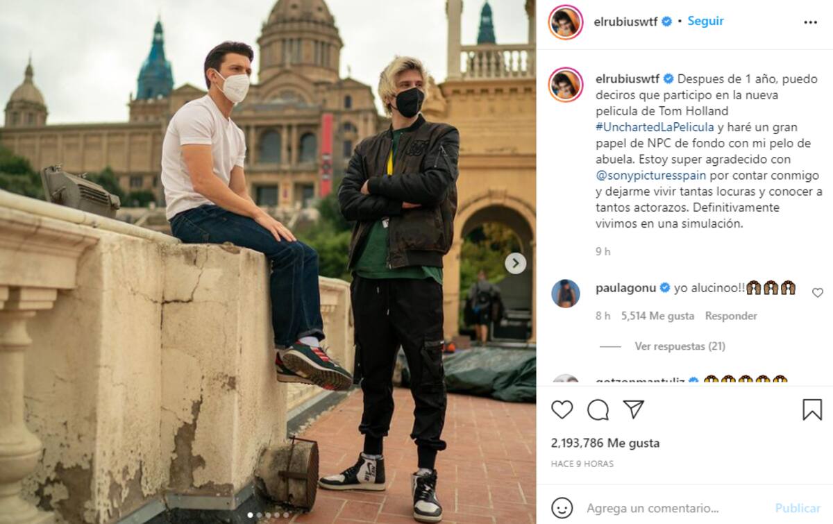 ESTADOS UNIDOS.- Después de presentar el primer tráiler de la película "Uncharted", la adaptación cinematográfica de la saga de videojuegos de Naughty Dog y Sony Pictures que es protagonizada por Tom Holland. Ahora, el famoso streamer y yotuber español Rubén Doblas, conocido como El Rubius, confirmó que formaría parte del film y presumió varias fotos con el protagonista.