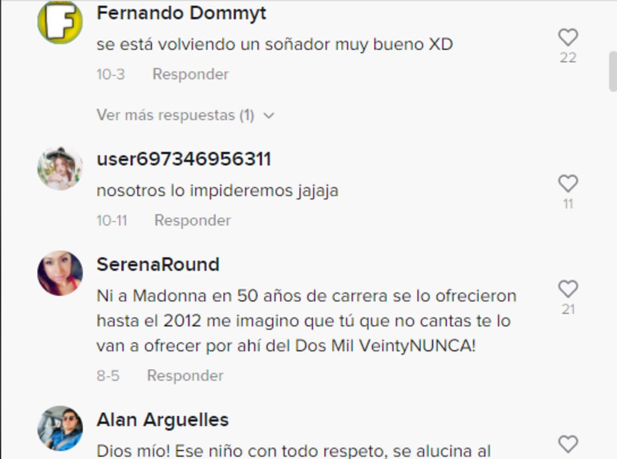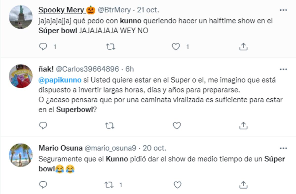 "Pudo ser todo y escogió ser la burla", "Superbowl? Neta? No tiene ni el 1% de trayectoria de los cantantes que se han presentado en el superbowl", "Ni a Madonna en 50 años de carrera se lo ofrecieron hasta el 2012, me imagino que tú que no cantas te lo van a ofrecer por ahí del Dos Mil VentyNUNCA!", "Ternurita", fueron tan solo algunas de las expresiones que se podían leer en el TikTok que compartieron sobre el comentario de Kunno.
