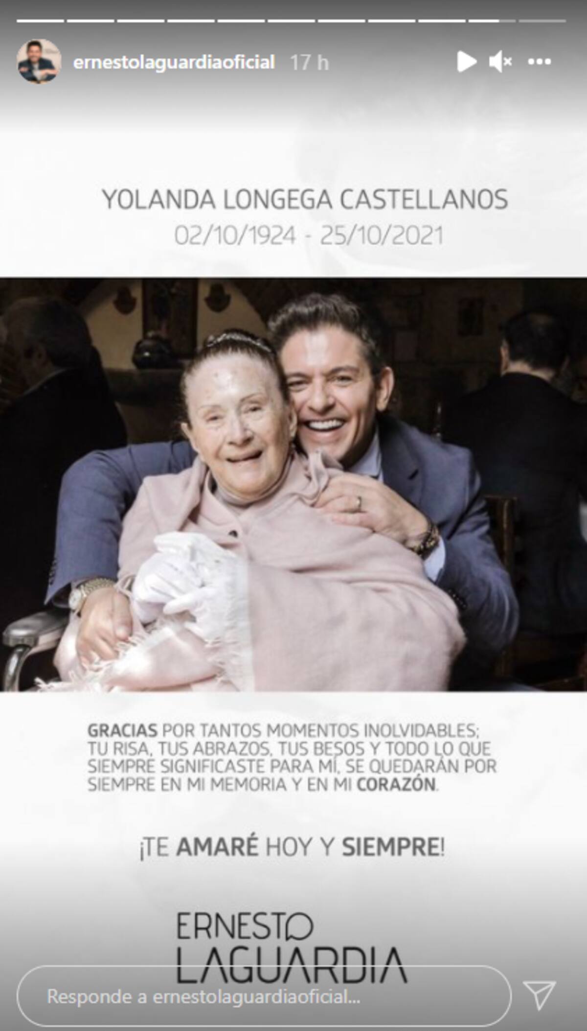 Aunque la pérdida le produjo un gran dolor, Laguardia también quiso conmemorar la vida de su fallecida madre con tiernas palabras y escribió lo mucho que significó Yolanda Longega para el actor y para toda su familia.