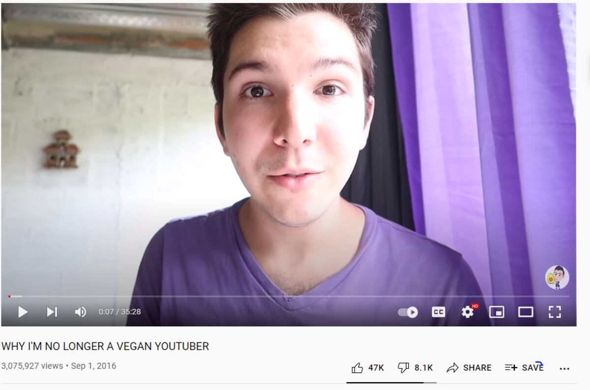 Un día su canal dio un drástico giro luego de subir un video en el que anunciaba que ya no sería vegano. Según afirmó en el clip, no se sentía cómodo en la comunidad dentro vegana de YouTube, cita a otras youtubers quienes afirman que el movimiento a menudo se usa para juzgarse entre ellos. "Sigo siendo vegano, amo a los animales y seguiré luchando por ellos, solo no volveré a hablar del tema, no seré un youtuber vegano", dice en el vide.