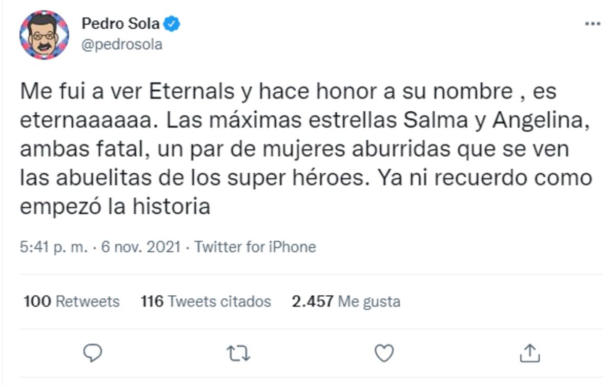 Y durante este fin de semana, Pedrito Sola se ganó el desprecio de los internautas por estallar contra la película de Marvel, específicamente sobre la actuación de Salma Hayek y Angelina Jolie, y parece haber sido tanto su desprecio que las calificó como las "abuelitas" de los superhéroes.