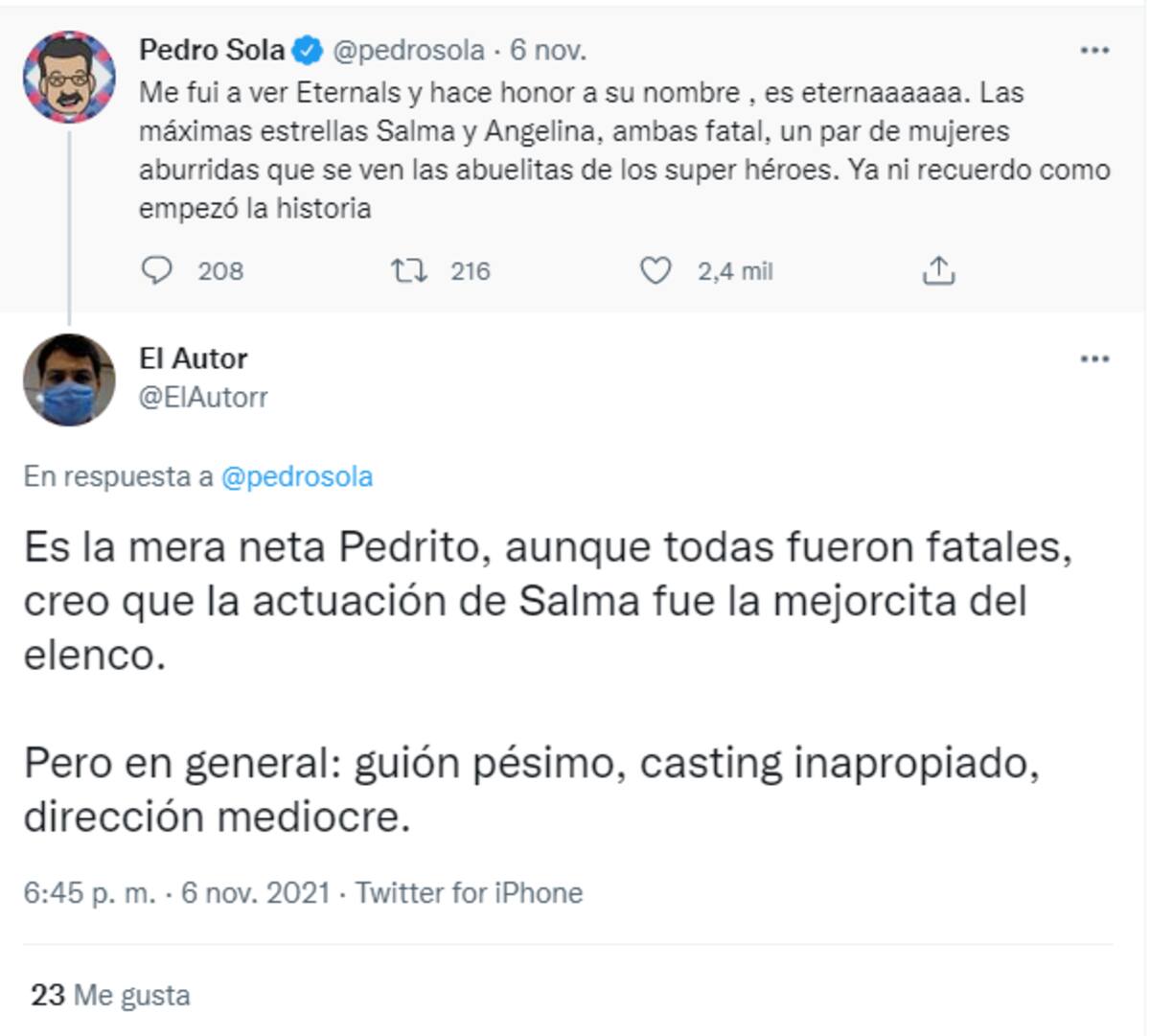 Sobre todo, porque la película # 26 de Marvel cuenta con la participación de Salma Hayek, interpretando a Ajak, y también con Angelina Jolie. Sin embargo, parece que no a todos les gustó su trabajo, tal fue el caso de Pedro Sola , quien utilizó su cuenta de Twitter para arremeter contra las actrices.