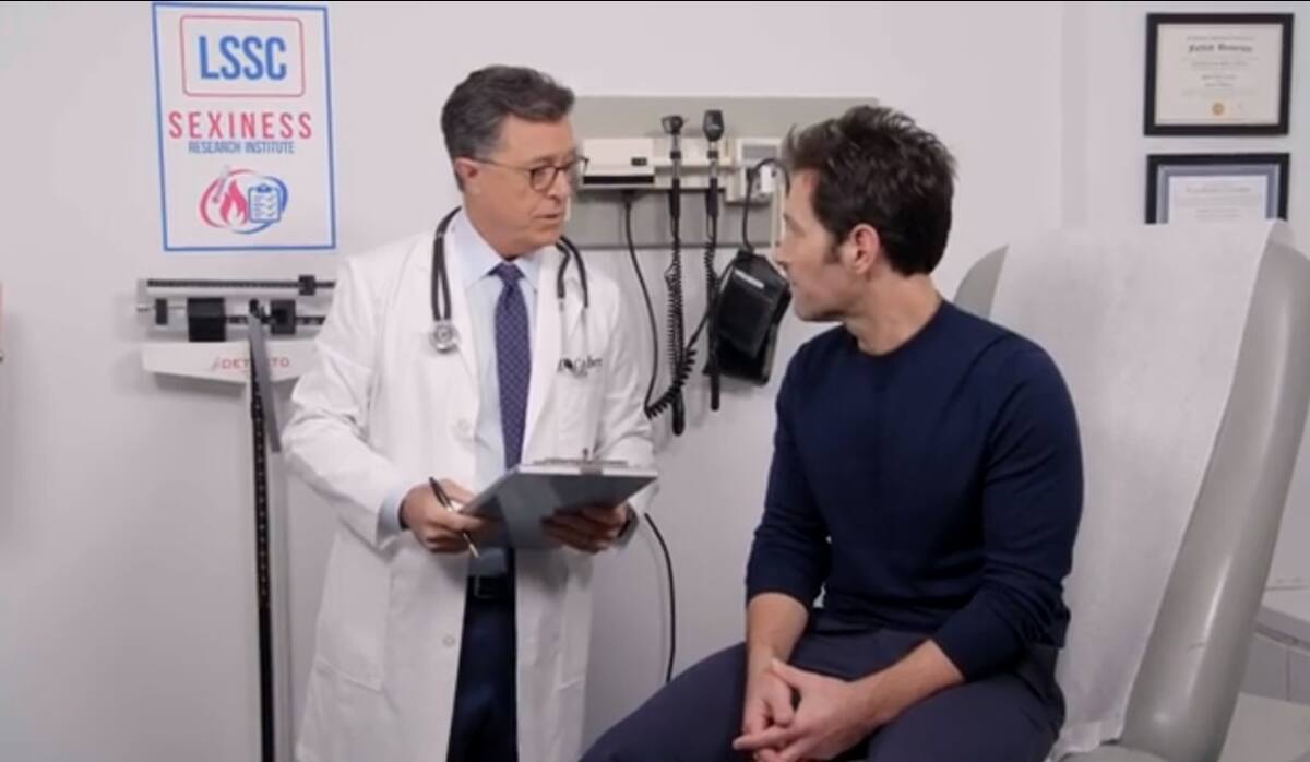 En un sketch de comedia, Colbert le hizo al actor un examen físico para ver qué tan sexy y saludable podría llegar a estar, además de una ronda de evaluación al estilo de “Westminster Dog Show”, donde se presentan los canes más finos y espectaculares del mundo y se les realizan pruebas para valorar su raza.