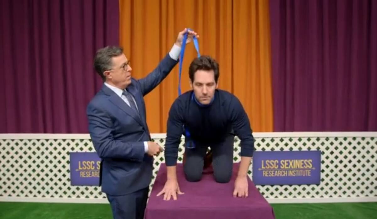 Luego de pasar las pruebas impuestas por Stephen Colbert, finalmente Paul Rudd fue reconocido como “el hombre vivo más sexy”, galardón entregado por la revista People, mientras la estrella de Hollywood hacía una parodia sobre las reinas de belleza.