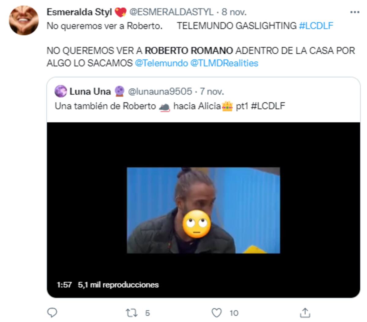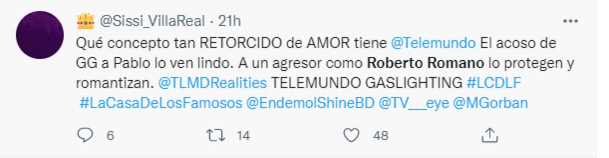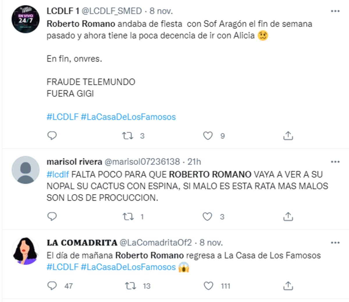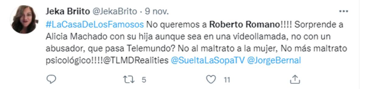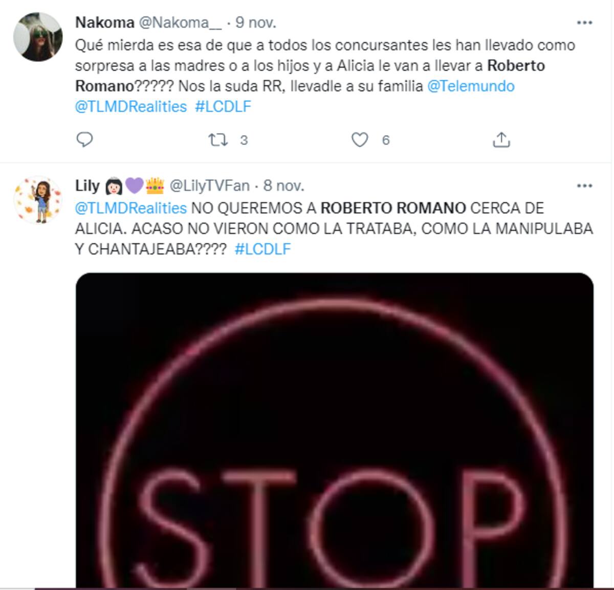 "No queremos a Roberto Romano, por algo lo sacamos", "Qué concepto tan retorcido de amor tienen", "Acaso no vieron cómo la trataba y maltrataba?", "Alicia no merece vivir ese infierno", "Telemundo cómplice de Roberto Romano al matrato psicológico de Alicia Machado", "No al maltrato a la mujer", fueron tan solo algunos de los comentarios que destacaron en la red social.