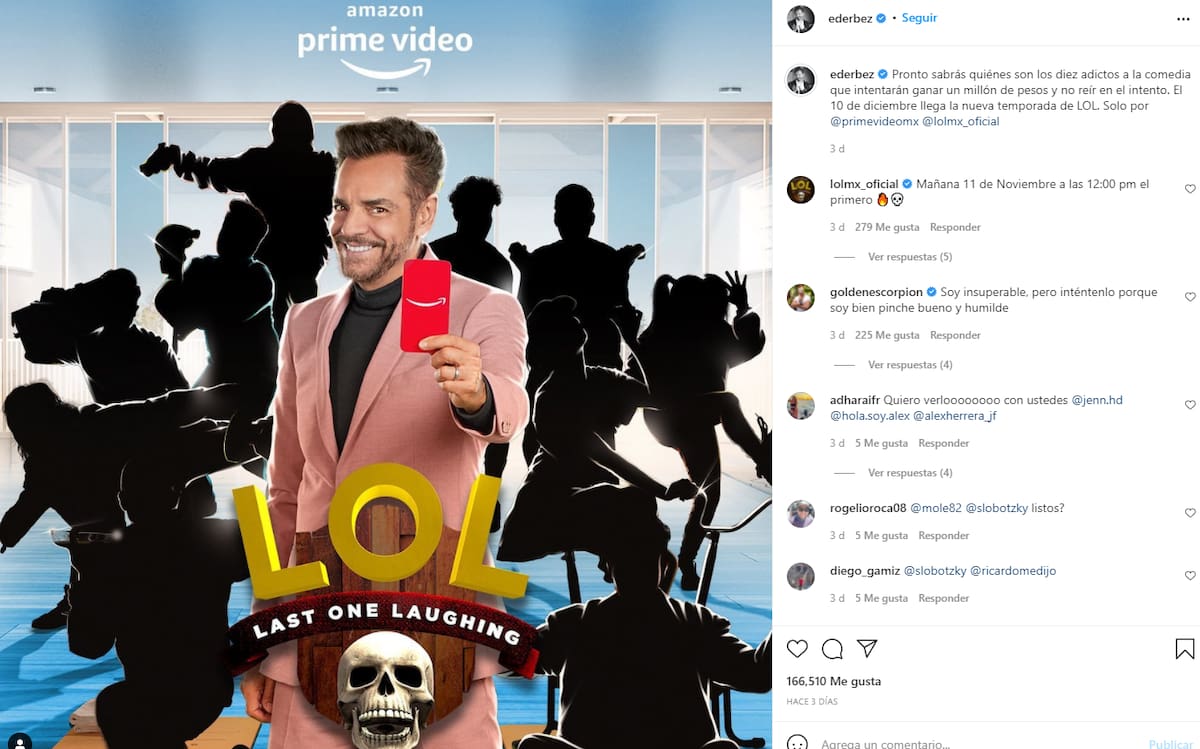 Mientras que, de momento, Derbez se encuentra promocionando la nueva temporada del reality "LOL: Last One Laughing", donde los comediantes más conocidos llegan a una casa para luchar por hacer reír a sus compañeros, sin embargo, quien se ríe deberá ser expulsado inmediatamente, por lo que primero en reír es quien debe irse.