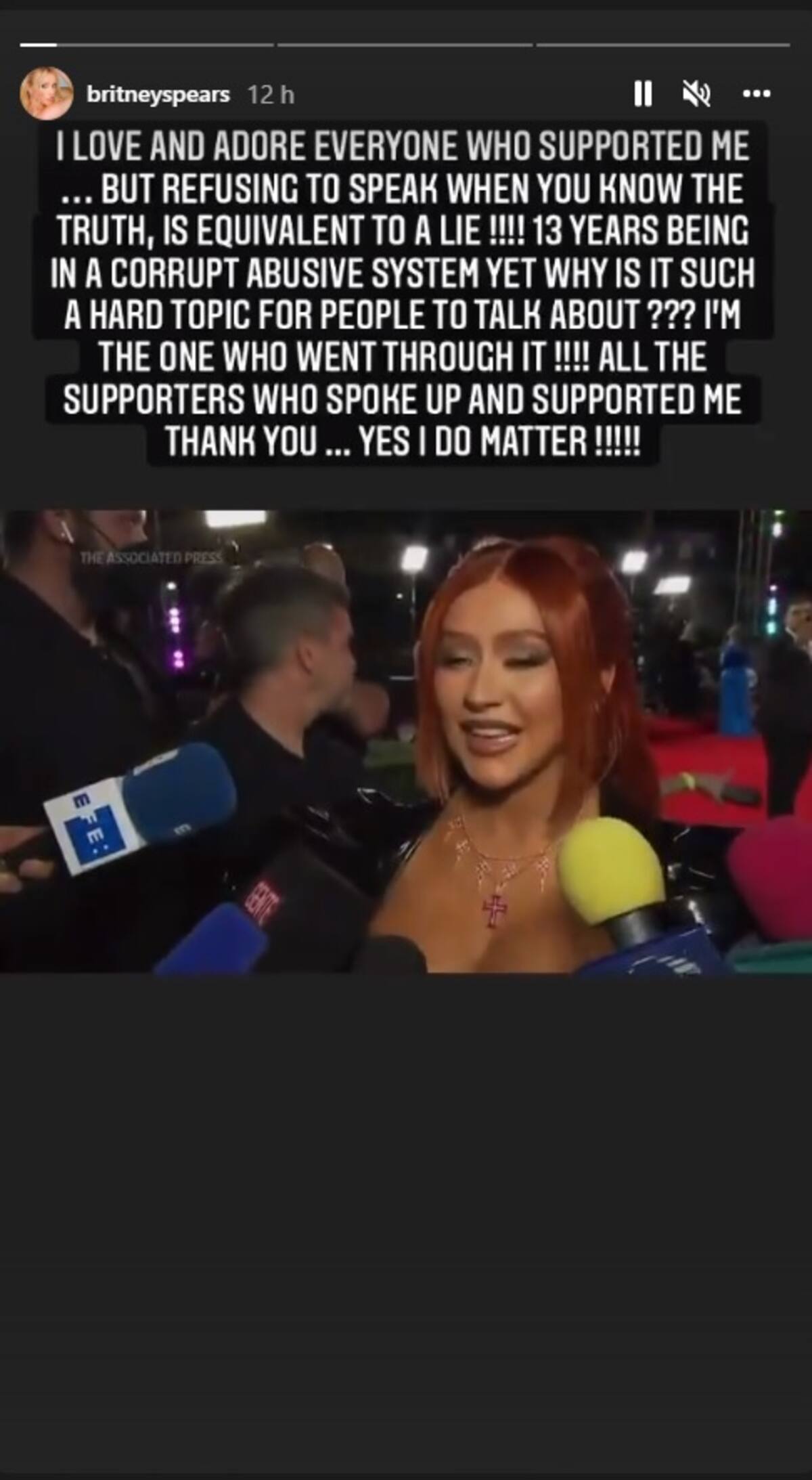 Amo y adoro a todos los que me apoyaron... ¡¡¡pero negarse a hablar cuando sabes la verdad es equivalente a una mentira!!”, escribió Britney mientras compartía una entrevista de Christina.