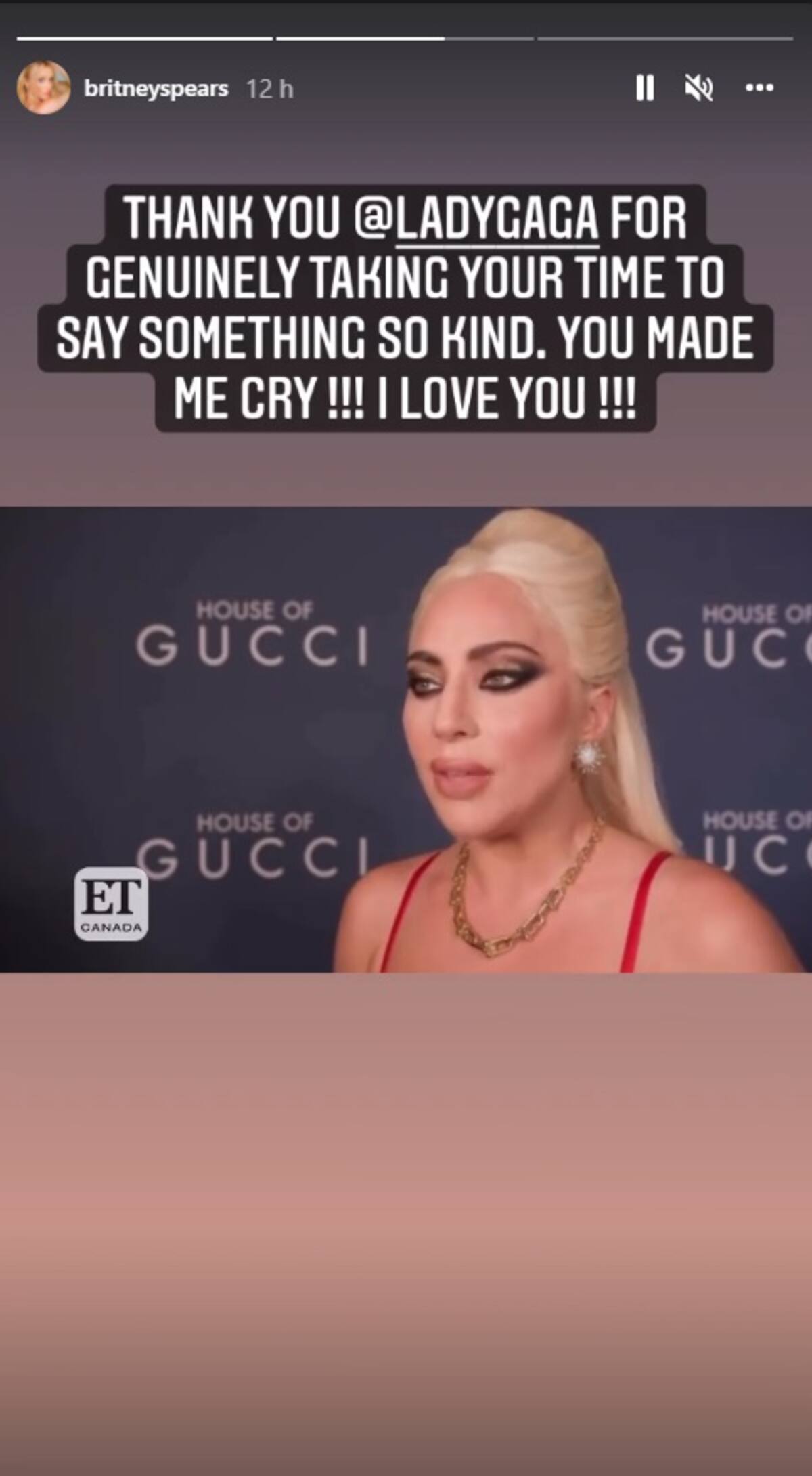 “Gracias @ladygaga por tomarse su tiempo para decir algo tan amable. ¡¡¡Tú me haces llorar!!! ¡¡¡Te quiero!!!”, escribió Britney en otra publicación.