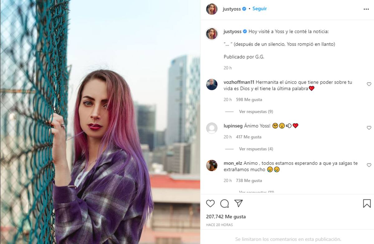 "Es injusto! Pero todo cae sobre su propio peso. Todo va a estar bien", "Te estamos esperando con los brazos abiertos", "Ardemos en rabia", "Mucha fuerza", "Seguro fue la noticia de que Axel N (agresor de Ainara) quedó libre con la condición de que no se acerque a Ainara", "Fortaleza mi Yoss aquí estamos y bien encabronados"; fueron tan solo algunos de los comentarios.