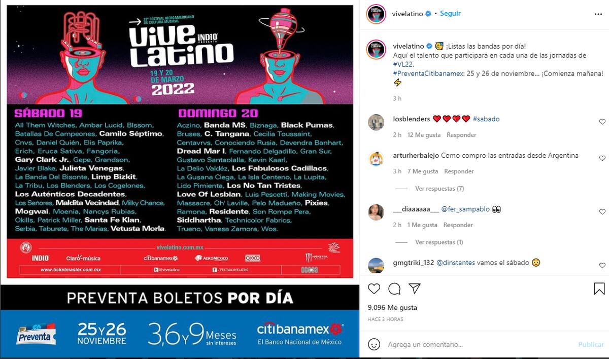 El festival también anunció que el próximo 25 y 26 de noviembre iniciará la preventa para comprar las entradas por día del Vive Latino 2022, por si solo quieres asistir a ver uno de los line-up. Para luego comenzar con la venta general.