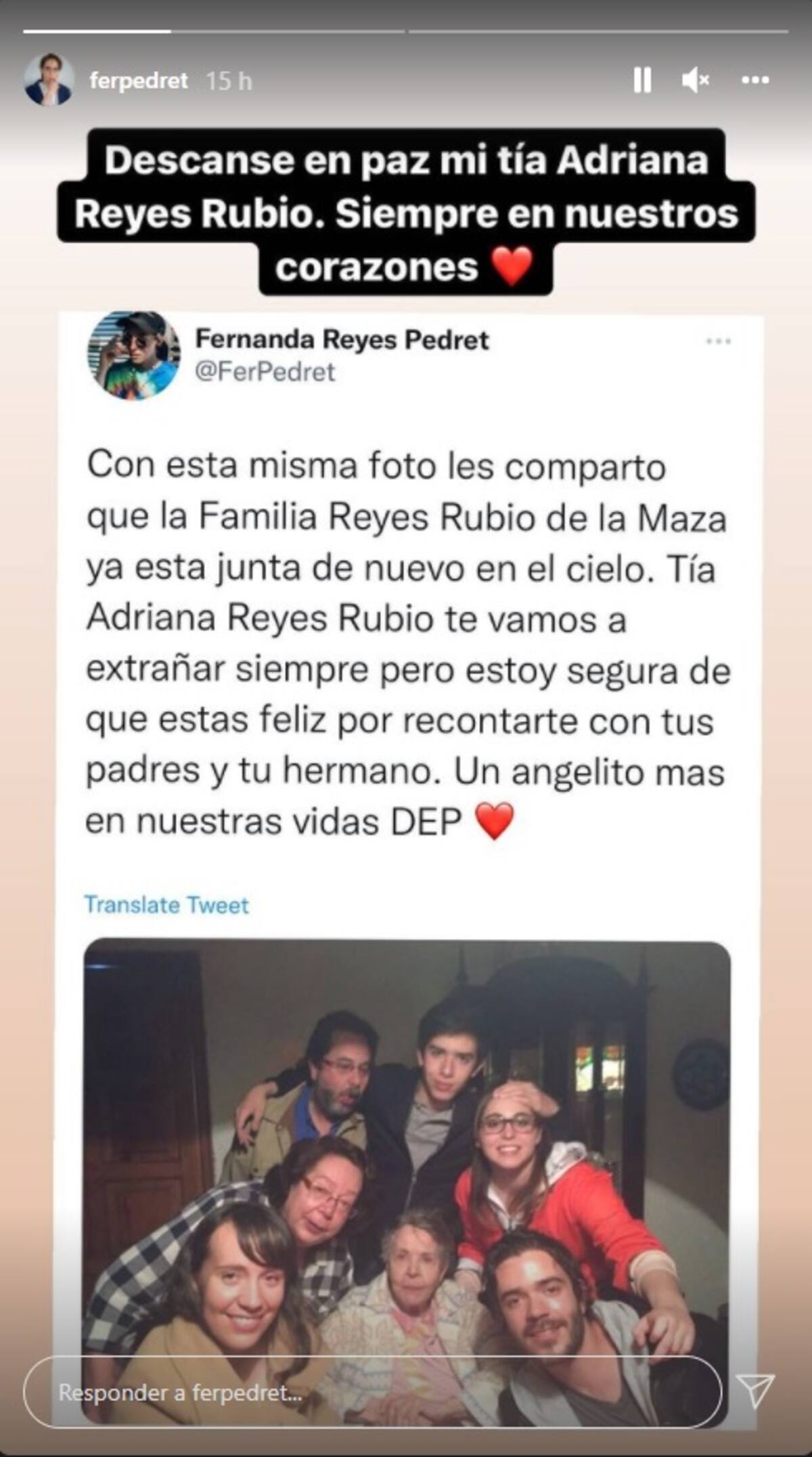 “Con esta misma foto les comparto que la familia Reyes Rubio de la Maza ya está junta de nuevo en el cielo. Tía Adriana Reyes Rubio te vamos a extrañar siempre, pero estoy segura que estás feliz por reencontrarte con tus padres y tu hermano. Un agelito más en nuestras vidas. DEP”, expresó Reyes Petret.