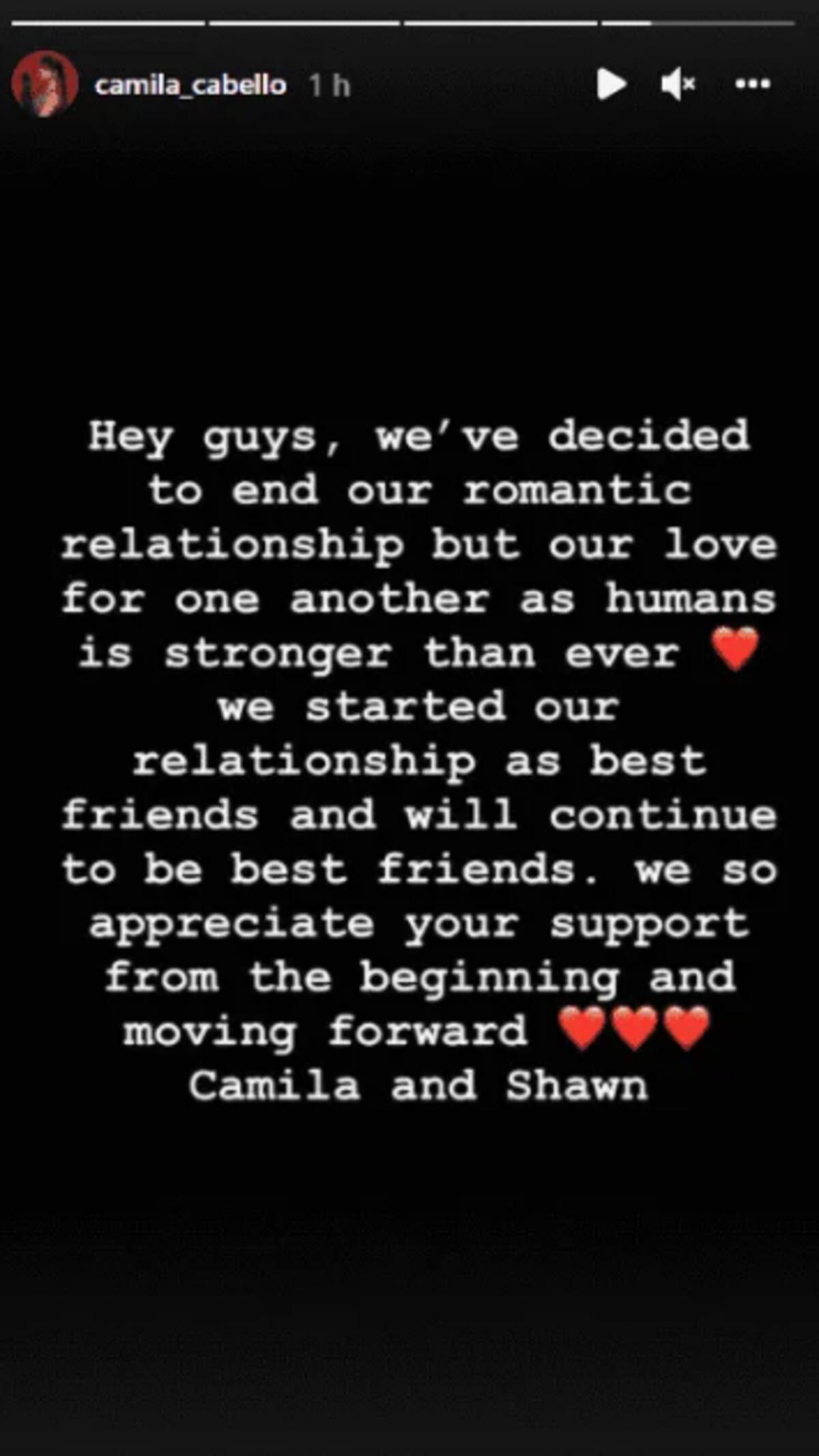 MÉXICO.- Camila Cabello y Shawn Mendes anunciaron su ruptura el pasado 17 de noviembre, luego de casi tres años de relación. Fue por medio de un comunicado publicado en sus cuentas de Instagram que la pareja anunció que se separaba; no ofrecieron detalles de la ruptura, pero aseguraron que siempre existiría una relación amistosa entre ellos.