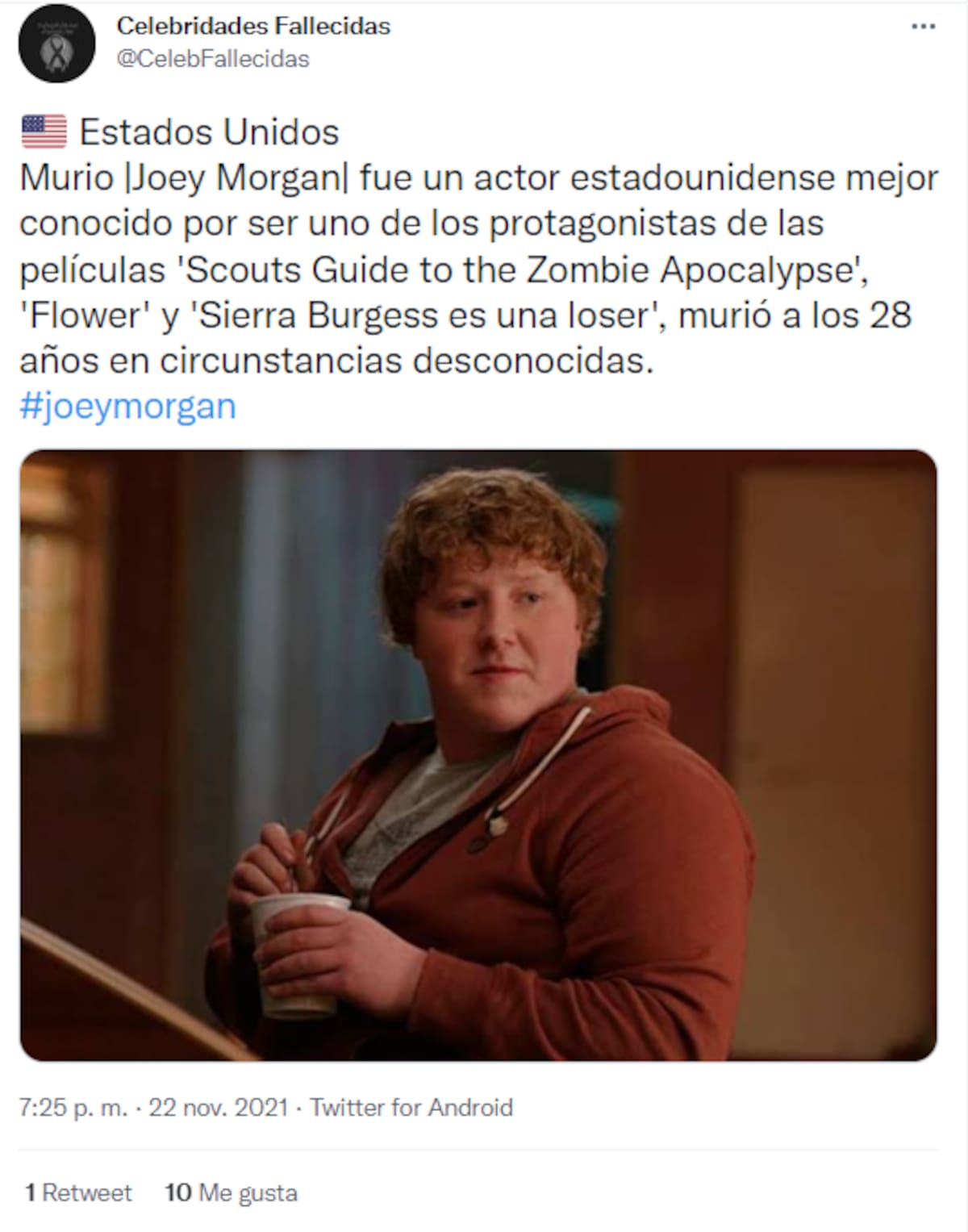 CIUDAD DE MÉXICO.- La inesperada muerte de Joey Morgan que ocurrió el pasado 21 de noviembre conmocionó tanto a sus familiares, amigos como a sus colegas de trabajo, ya que fue un joven talentoso de 28 años que se dio a conocer por sus papeles en películas como "Compadres", "Guía de Scouts para el Apocalipsis Zombie", "Max Reload and the Nether Blaster", entre otras.