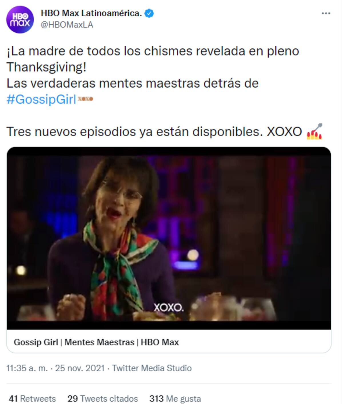 ¡La madre de todos los chismes revelada en pleno Thanksgiving! Las verdaderas mentes maestras detrás de #GossipGirl Tres nuevos episodios ya están disponibles. XOXO" se lee en la publicación del video de HBO Max.