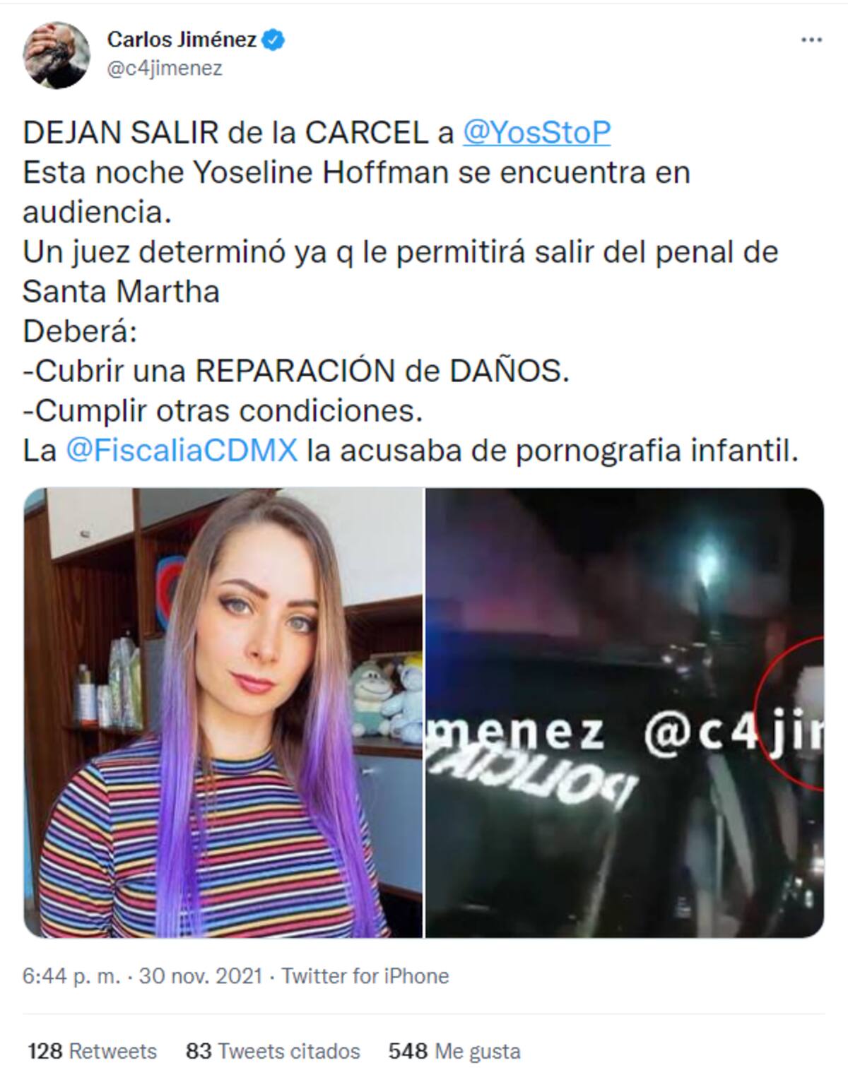 MÉXICO.- Hace unos minutos, por medio de su cuenta oficial de Twitter, el periodista Carlos Jiménez reportó que la Youtuber Yoseline Hoffman, conocida como Yosstop, saldrá está noche del penal de Santa Martha Acatlita donde se encuentra recluida desde el pasado 29 de junio.
