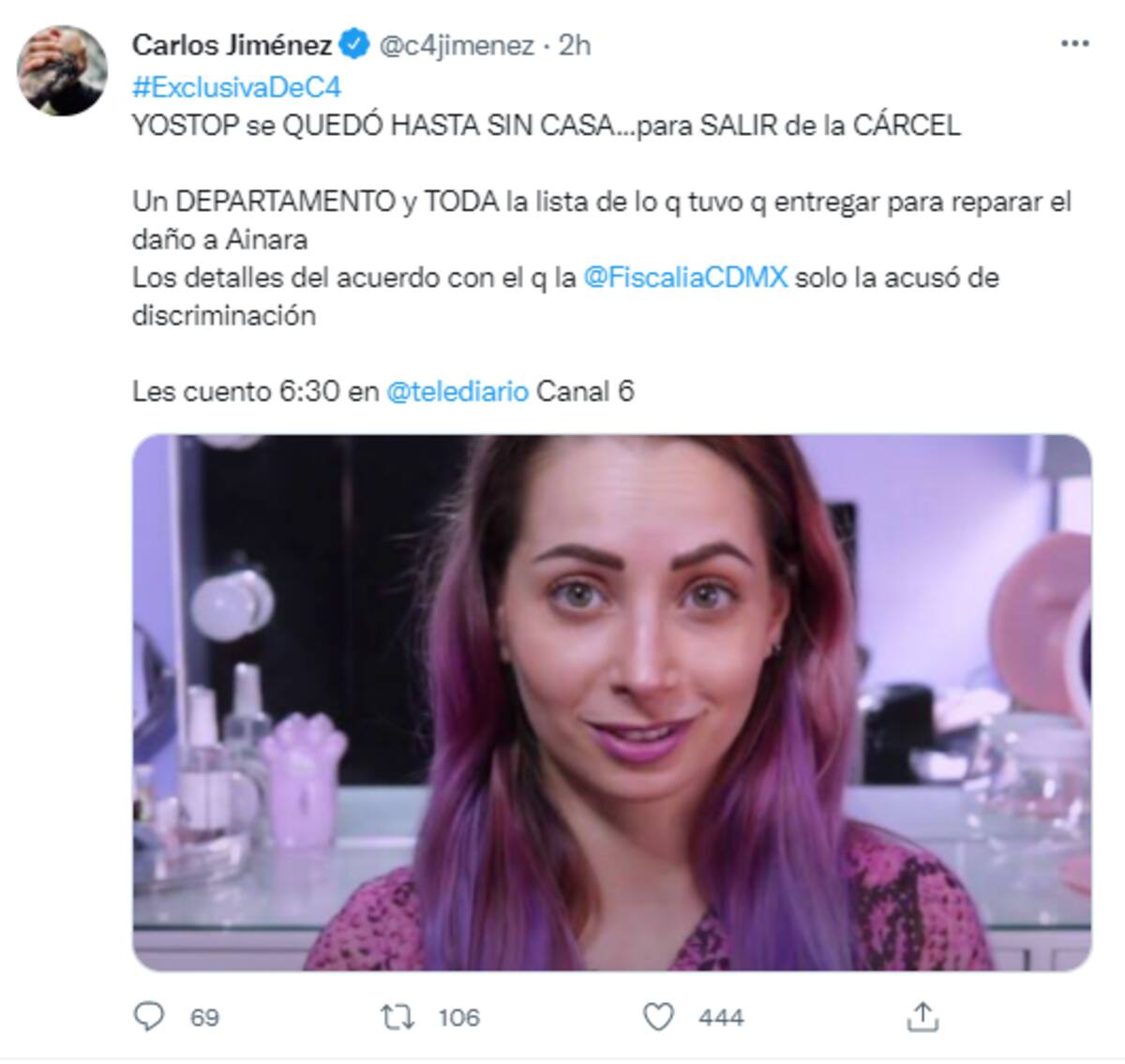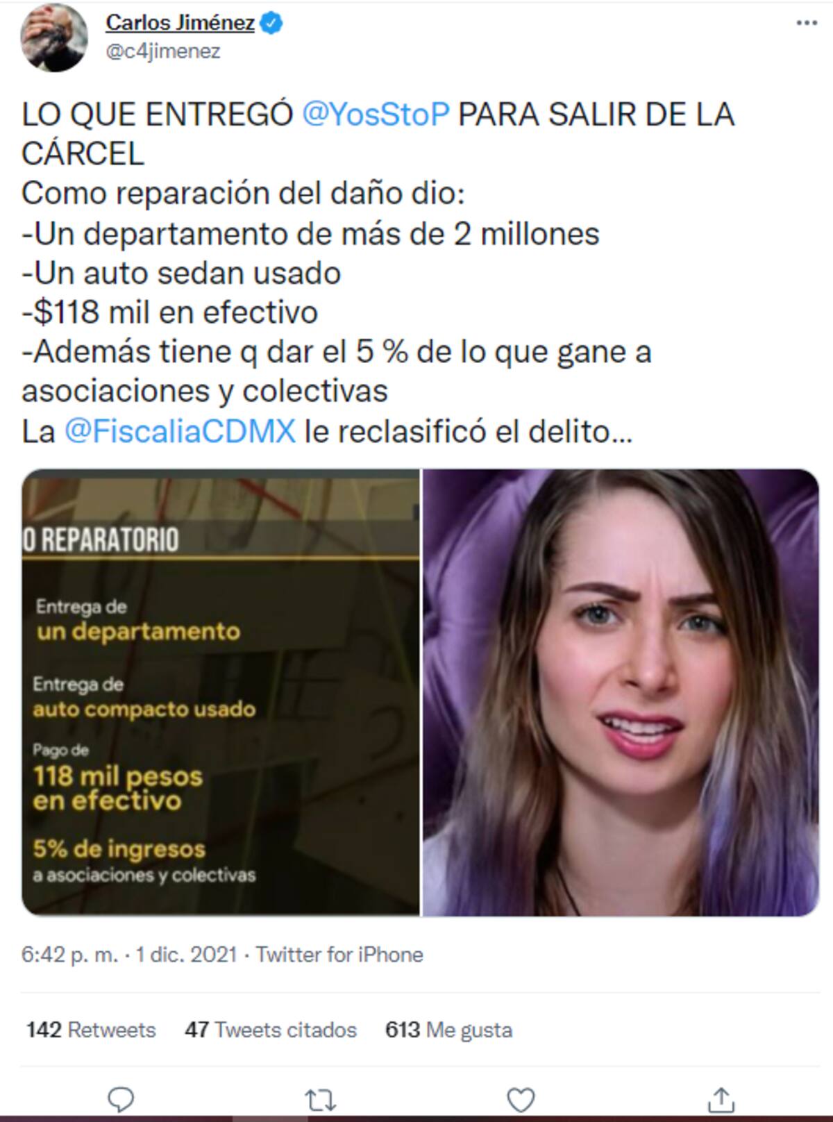 “Se le ordenó que tendrá que publicar mensualmente un video en el que demuestre qué aprendió en estos cursos y se le prohibió hablar de forma denigrante de cualquier persona. Todo esto lo tendrá que cumplir al menos en los próximos tres años, de no hacerlo YosStop podría ser detenida y regresada de nueva cuenta a la cárcel ”, informó Jiménez.