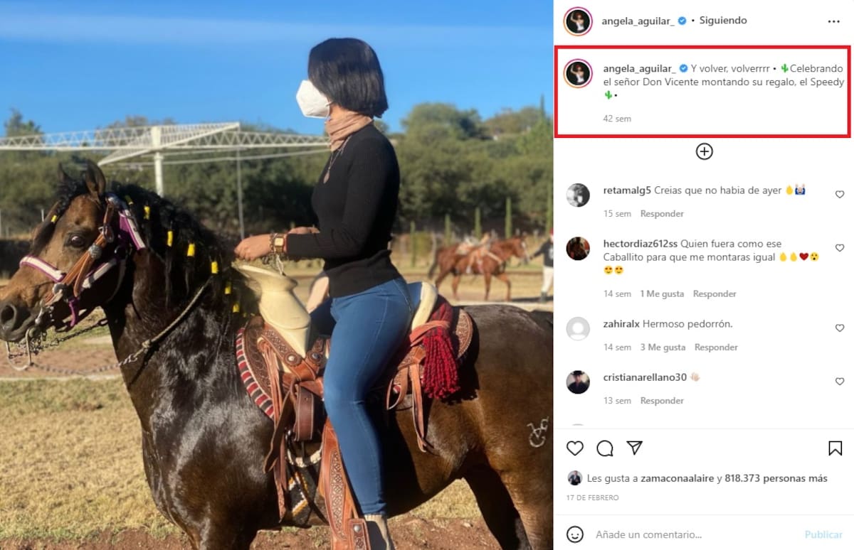 Y volver, volver… Celebrando el señor Don Vicente montando su regalo, el Speedy”, escribió Ángela en el pie de foto en la que aparece arriba del caballo que tiene la marca del “fierro” de “El Charro de Huentitán”.