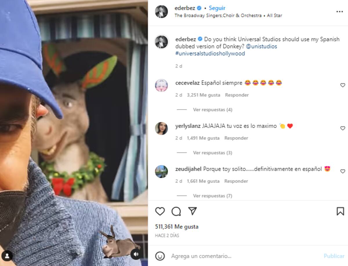 Además, el protagonista de grandes películas como "No se aceptan devoluciones", le preguntó a los usuarios si creían que el parque de diversiones de Estudios de Univesal en Hollywood deberían usar su versión en español para Burro, a lo que muchos respondieron que no debían pensarlo ni dos veces, pues su doblaje es algo característico del film.