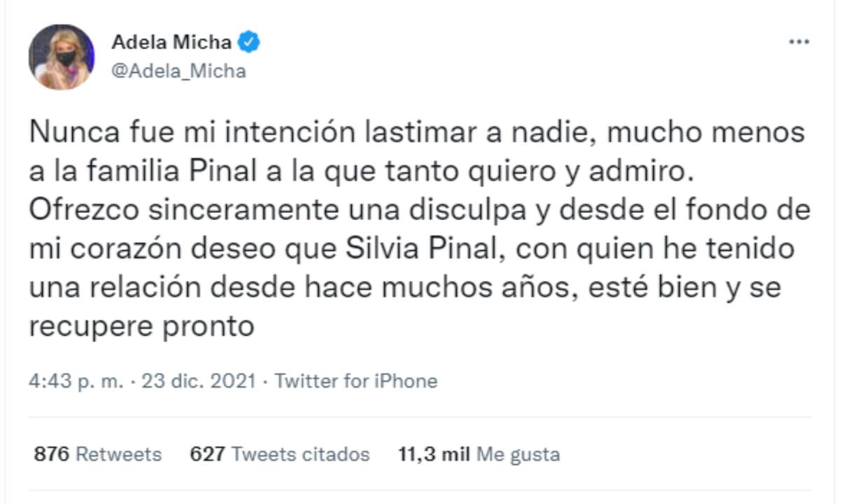 Nunca fue mi intención lastimar a nadie, mucho menos a la familia Pinal a la que tanto quiero y admiro. Ofrezco sinceramente una disculpa y desde el fondo de mi corazón deseo que Silvia Pinal, con quien he tenido una relación desde hace muchos años, esté bien y se recupere pronto", escribió.