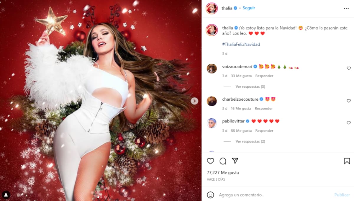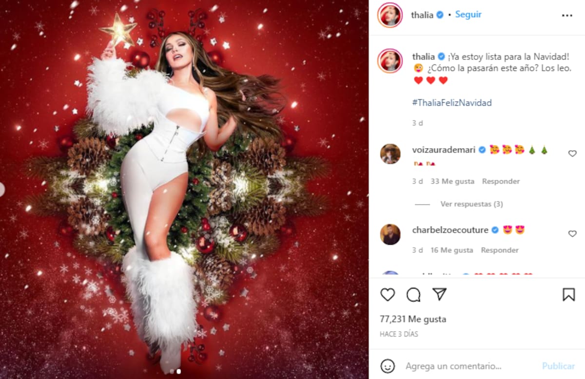 Mientras sostenía una estrella en su mano derecha, Thalía lució más increíble que nunca al mostrar su espíritu navideña con estas fotos que causaron revuelo entre sus seguidores, pues hubo quienes la consideraron como una reina de la Navidad por su inigualable outfit que nadie podría mostrar igual que ella.