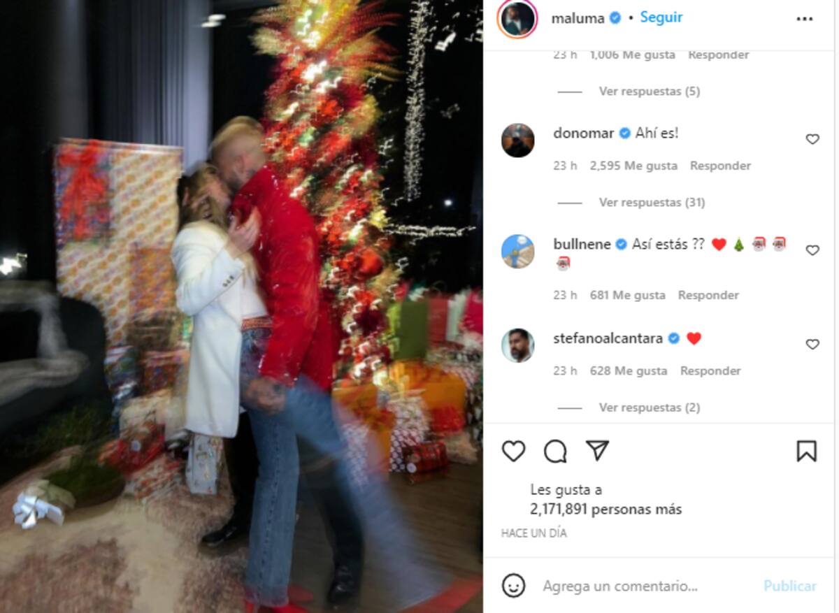 "Gracias Santa", se lee en la publicación en la que adjuntó un corazón rojo. En la instantánea, Maluma aparecía besando apasionadamente a Susana Gómez frente al pino de Navidad colmado de grandes regalos que podían llenar toda la sala.