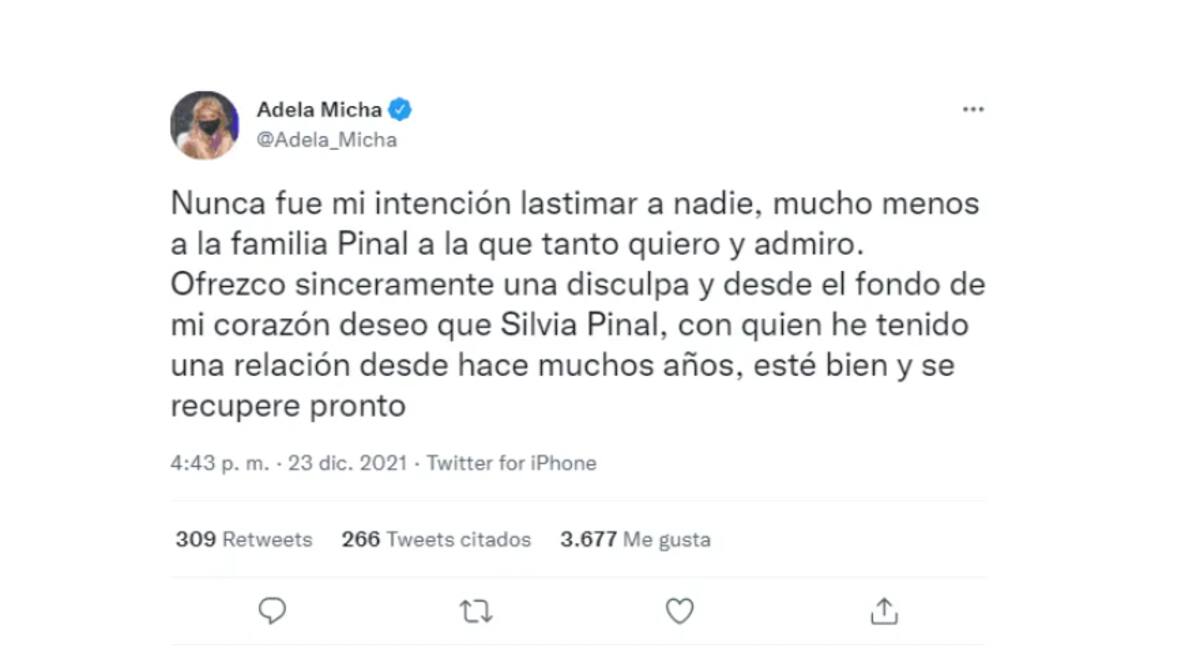 "Nunca fue mi intención lastimar a nadie, mucho menos a la familia Pinal a la que tanto quiero y admiro. Ofrezco sinceramente una disculpa y desde el fondo de mi corazón deseo que Silvia Pinal, con quien he tenido una relación desde hace muchos años, esté bien y se recupere pronto", escribió.
