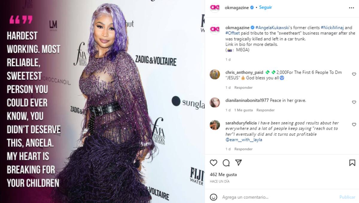 Ellas no serían las únicas famosas que dejaron un mensaje de cariño, ya que Nicki Minaj se pronunció sobre el posible feminicidio y expresó su duelo ante el asesinato de la víctima, incluso escribió que sentía tristeza por el duelo de sus cinco hijos.