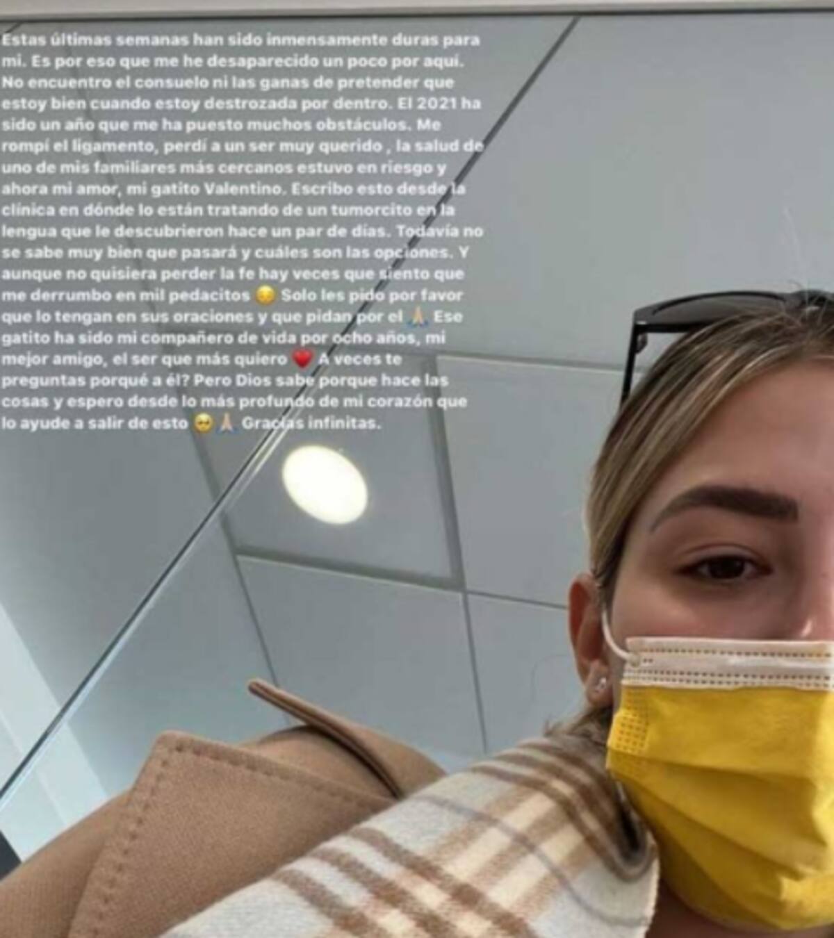 El 2021 ha sido un año que me ha puesto muchos obstáculos. Me rompí el ligamento, perdí a un ser muy querido, la salud de uno de mis familiares más cercanos estuvo en riesgo y ahora mi amor, mi gatito Valentino. Escribo esto desde la clínica en donde los están tratando de un tumorcito en la lengua que le descubrieron hace un par de días. Todavía no se sabe muy bien qué pasara y cuáles son las opciones", escribió la hija de Luis Miguel.