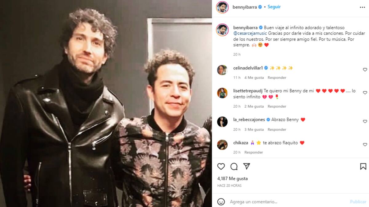 Benny Ibarra también expresó sus condolencias en Instagram luego de que César Ceja también formara parte de los tours del ex Timbiriche. “Buen viaje al infinito adorado y talentoso César Ceja. Gracias por darle vida a mis canciones. Por cuidar de los nuestros. Por ser siempre amigo fiel. Por tu música. Por siempre”, redactó el también actor.