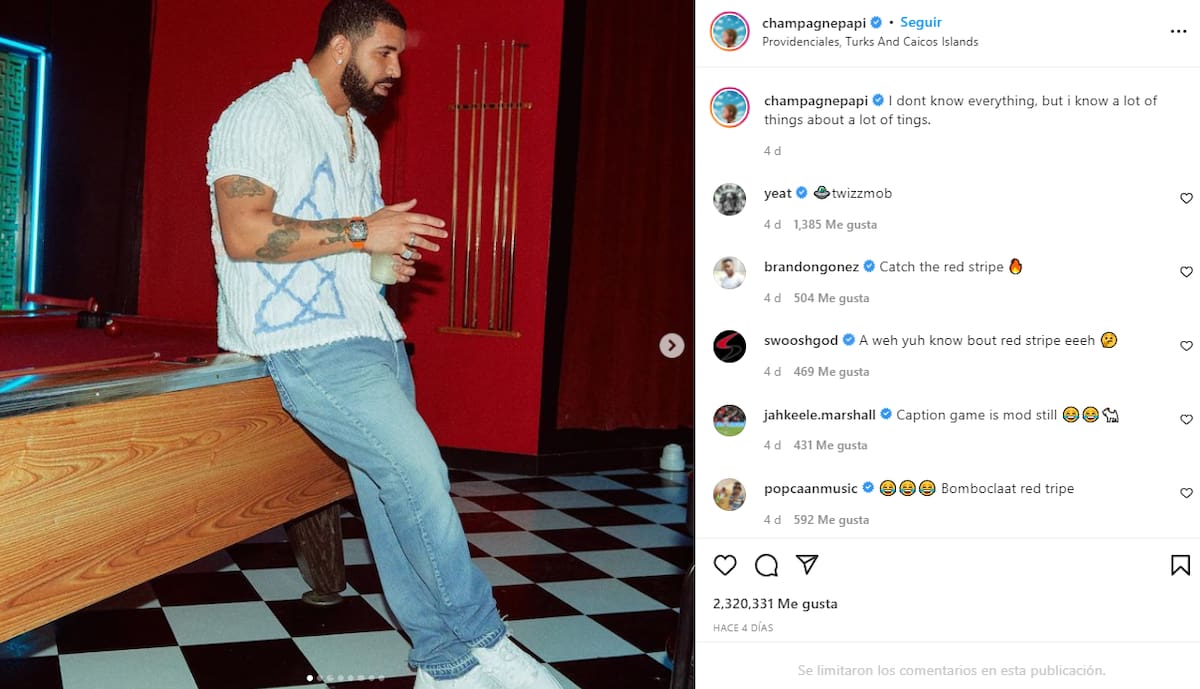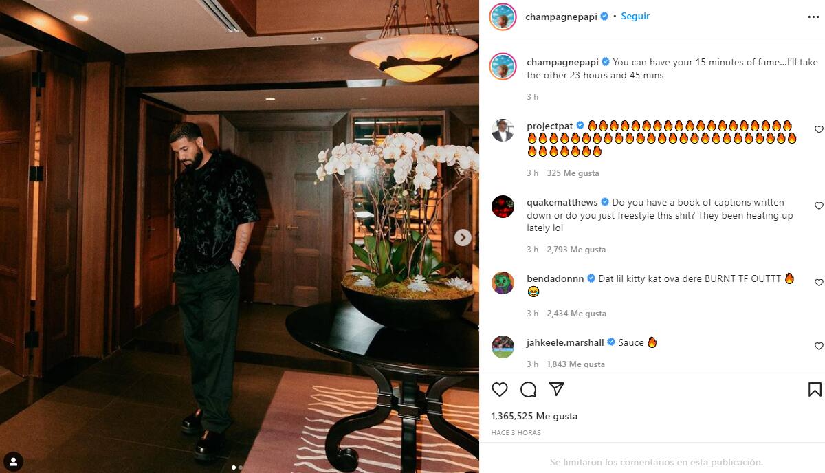 Por su parte, Drake no se ha pronunciado al respecto, aunque publicó una fotografía en su cuenta de Instagram que algunos internautas tomaron como su declaración oficial: "Puedes tener tus 15 minutos de fama, yo tomaré las otras 23 horas y 45 minutos", haciendo referencia a que le es indiferente todo lo que dicen sobre él y su vida privada.