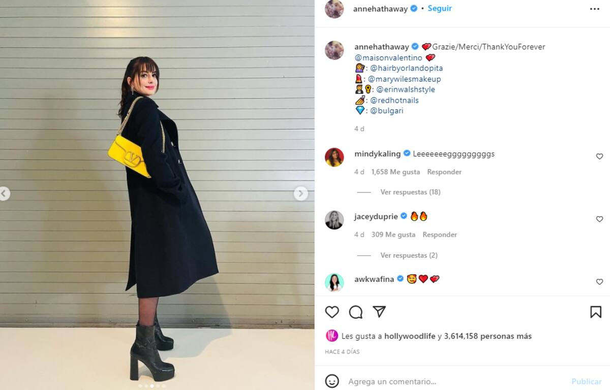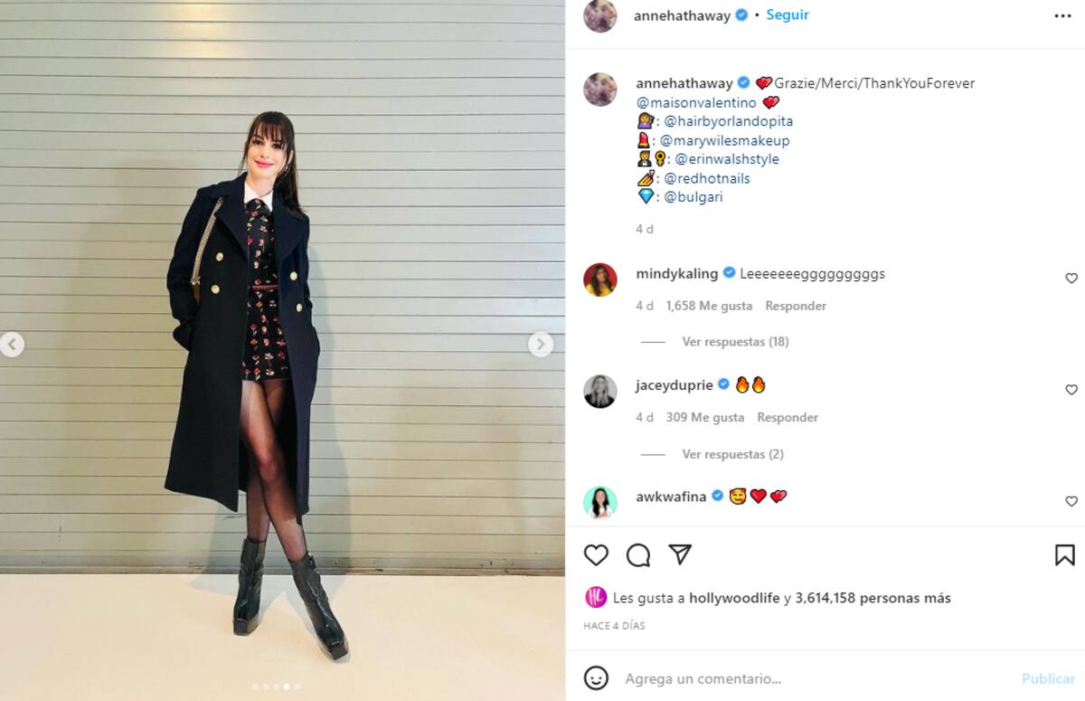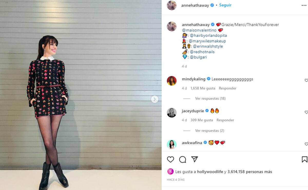 Dicha publicación se compartió desde la cuenta de Instagram de Hathaway , en donde lució un vestido corto Valentino con flores en tonos rosas y rojos con algunos pequeños detalles que decoraron el resto de la prenda, además de contar con un e legante cuello blanco que capturó la esencia de su personaje conocido en "El diablo viste a la moda".