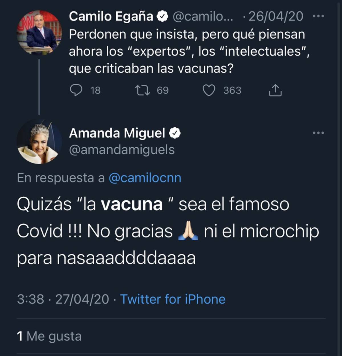 Sin embargo a poco tiempo de haberse dado la noticia, comenzó a surgir una polémica en la que algunos usuarios por Twitter dieron a conocer que Amanda Miguel es “antivacunas” y llegó a publicar varias notas en las que compartía historias donde se hablaba mal de vacunas.