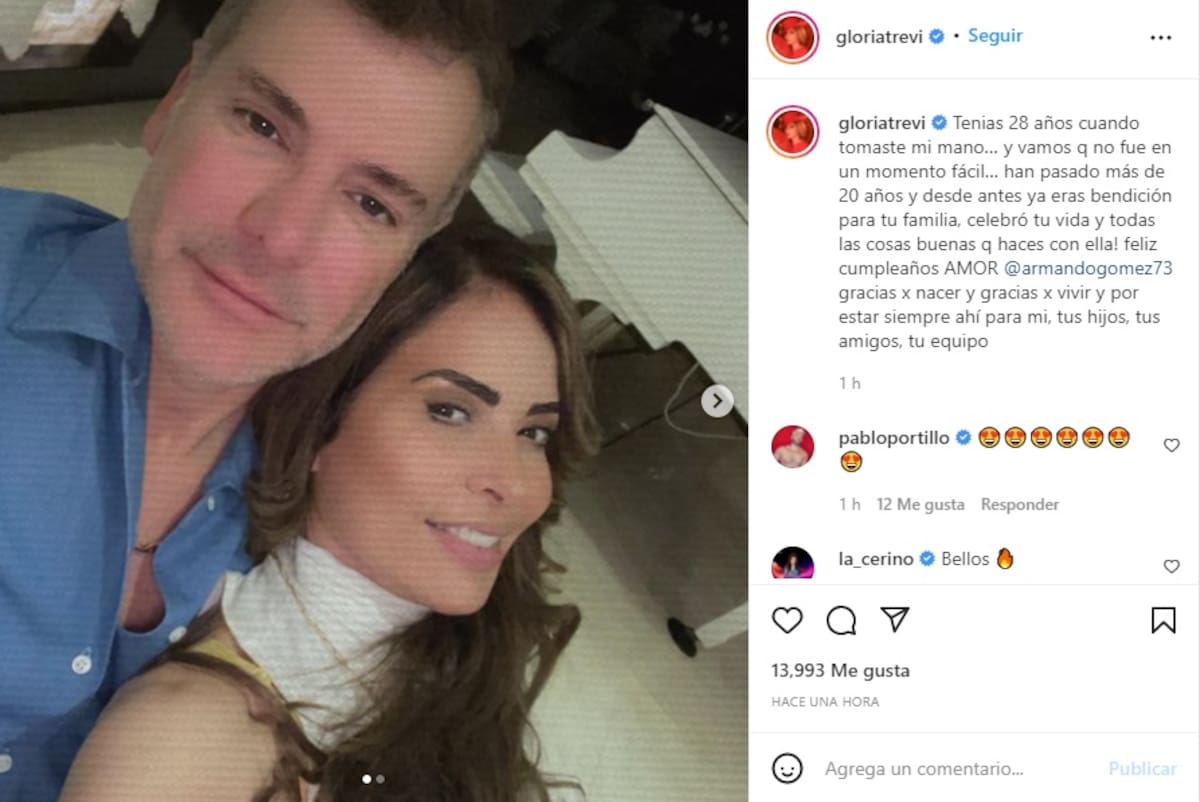 “Tenias 28 años cuando tomaste mi mano… y vamos q no fue en un momento fácil… han pasado más de 20 años y desde antes ya eras bendición para tu familia, celebró tu vida y todas las cosas buenas q haces con ella! feliz cumpleaños AMOR @armandogomez73 gracias x nacer y gracias x vivir y por estar siempre ahí para mí, tus hijos, tus amigos, tu equipo”, escribió Trevi junto a dos instantáneas, una de la actualidad y la otra de cuando se conocieron.