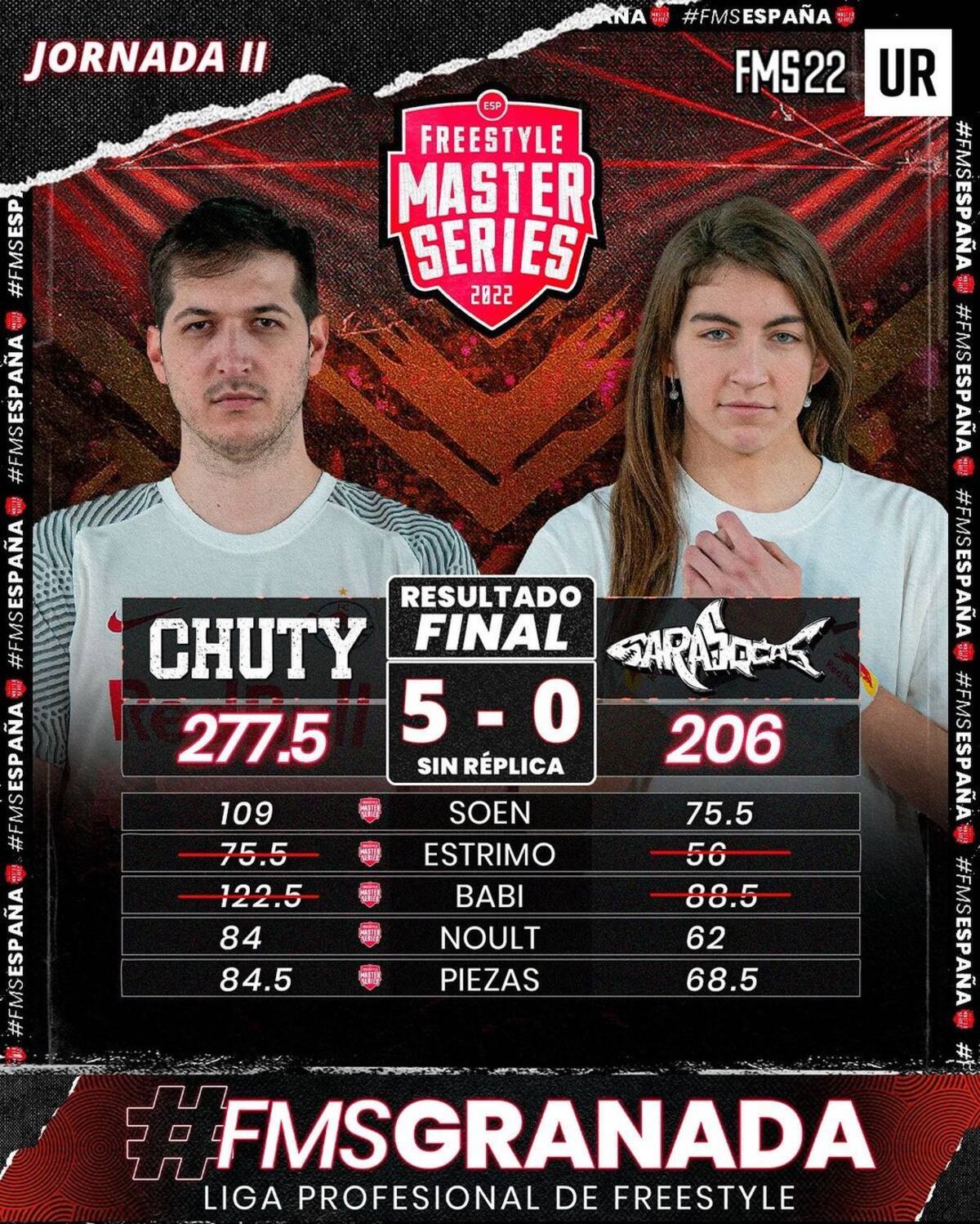 Chuty se encuentra en el pico de la tabla de puntaje de de Freestyle Master Series (FMS) España al sumar tres punto tras la victoria directa en su batalla de la segunda jornada ante Sara Socas.