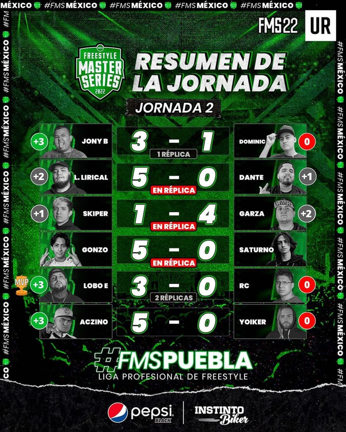 La jornada número dos de La Freestyle Master Serie de México (FMS México) celebrada en Puebla nos deja grandes batallas y la tabla de posiciones se modifica para dejar listo todo e ir definiendo a los clasificados para la primera fecha hacia la FMS Internacional.