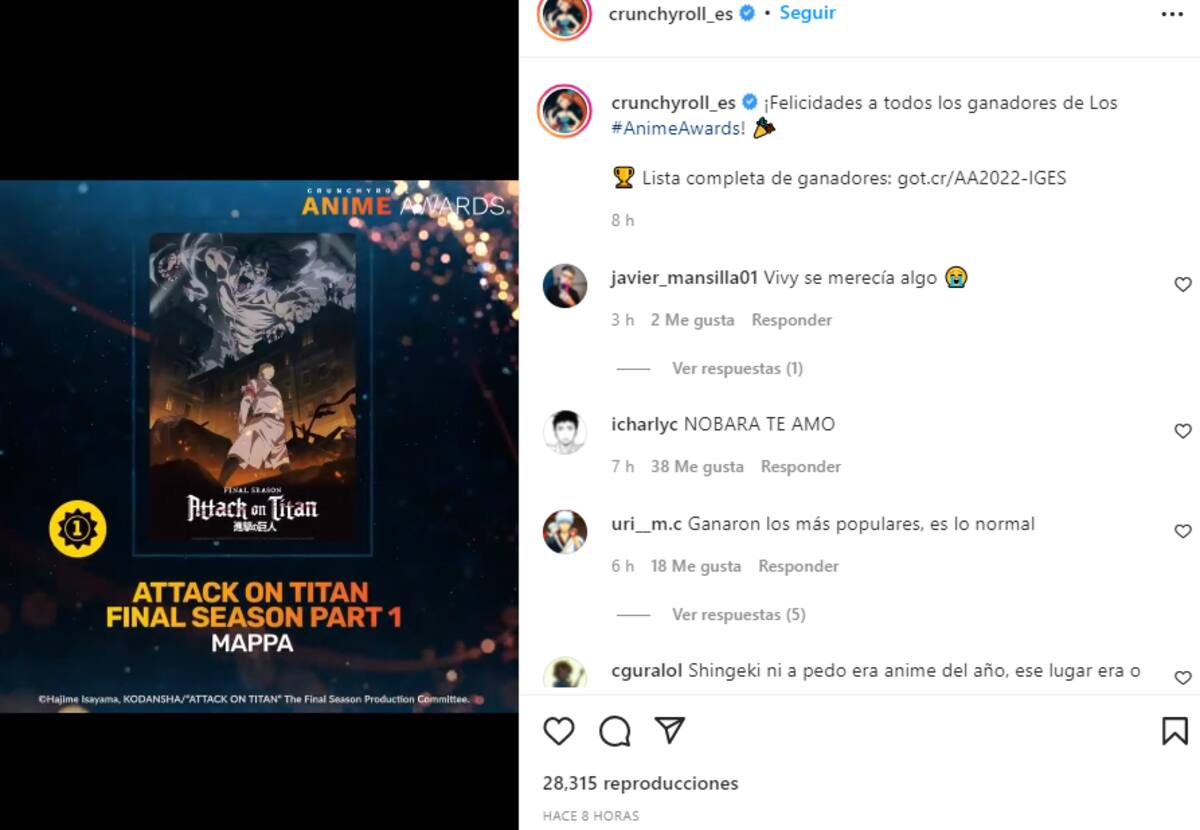 Así lo comunicó la plataforma de Streaming mediante una publicación sobre los resultados de dichos premios, en donde se mencionó que los resultados se basaron a partir de los millones de votos por parte de los usuarios de Crunchyroll, por lo que se espera que todos se sientan conformes con los ganadores.
