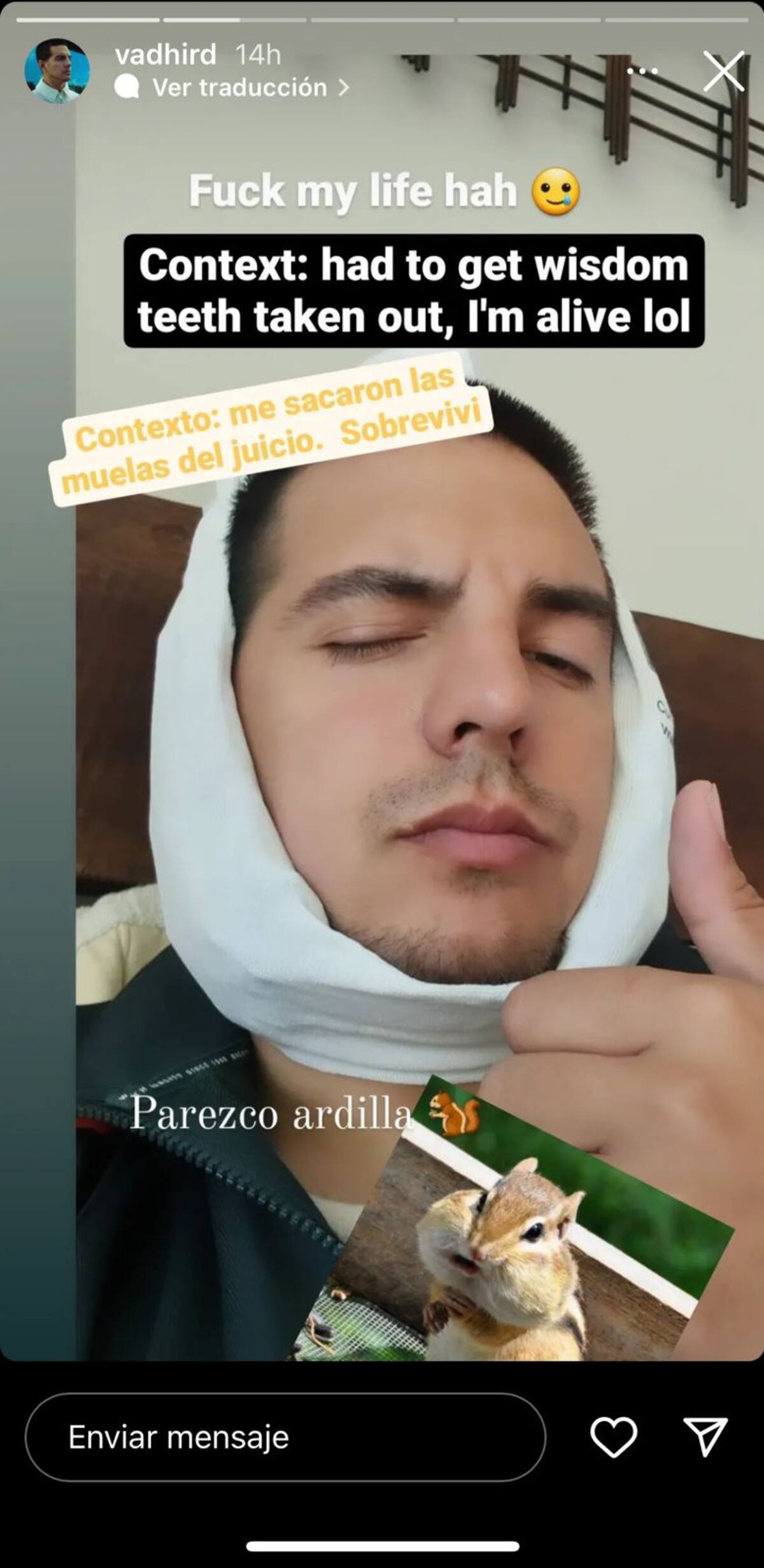 Además para agregar un poco de humor, el hijo de Eugenio Derbez reveló que debido a la fuerte inflamación que tiene en su rostro parecía como si fuera una “ardilla”, debido a lo grande que se le pusieron los cachetes.