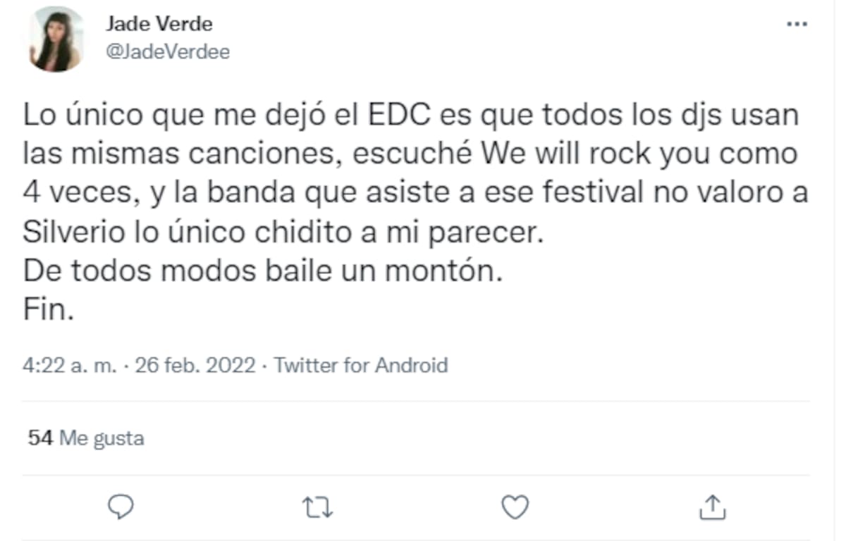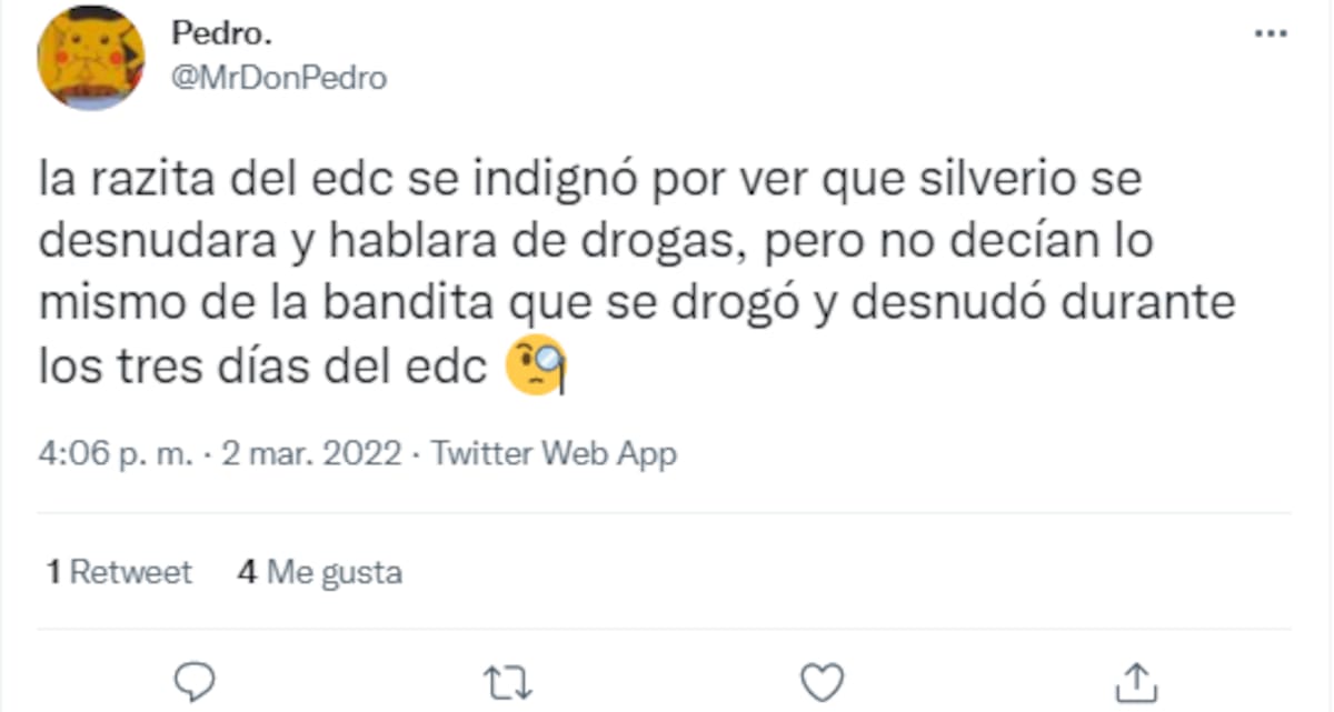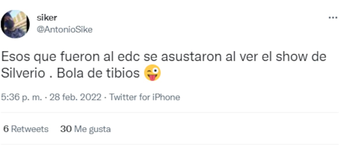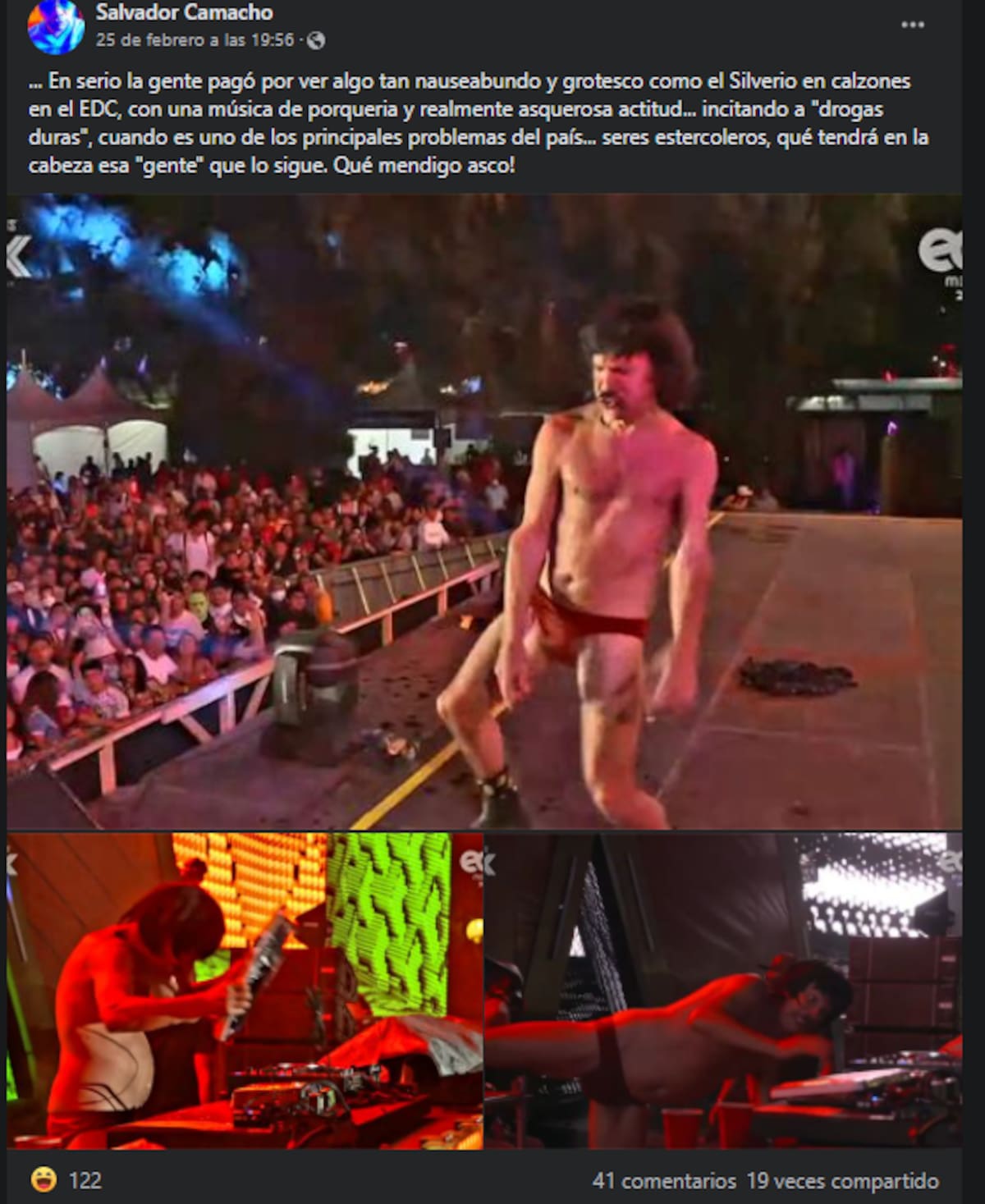 ¿En serio la gente pagó por ver algo tan nauseabundo y grotesco como el Silverio en calzones en el EDC? Con una música de porquería y realmente asquerosa actitud... incitando a 'drogas duras' cuando es uno de los principales problemas del país... seres estercoleros, qué tendrá en la cabeza esa 'gente' que lo sigue. ¡Qué mendigo asco!", escribió.