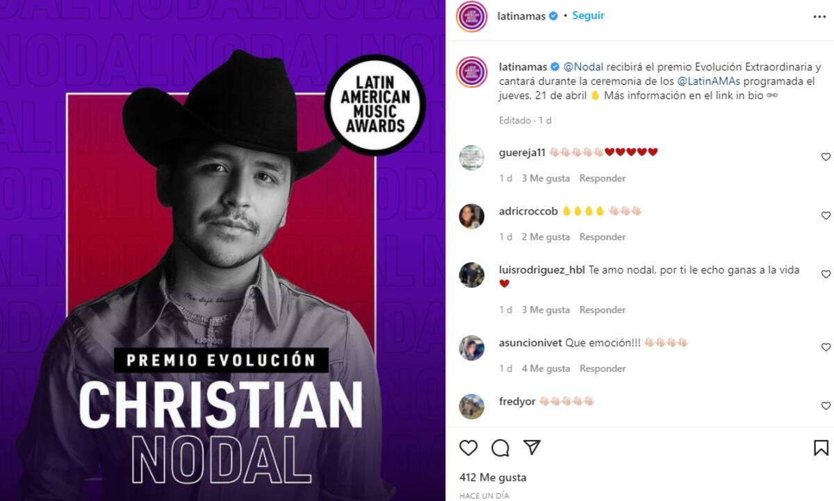 CIUDAD DE MÉXICO.- Sin duda alguna, Christian Nodal ha logrado destacar en el ámbito musical por su gran talento que sus fanáticos siempre aplauden, además de contar con un repertorio de canciones que se volvieron las favoritas de muchos. Es por ello que el artista sonorense será premiado en la séptima edición de los Latin American Music.