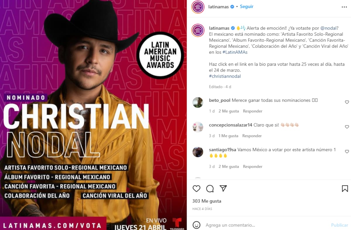 Esto le ha brindado al mundo de la música mexicana un nuevo giro a este sonido reconocido mundialmente, convertido ahora por este talentoso artista en ‘Mariacheño’, entrando en el gusto de jóvenes y adultos por igual", agregaron los organizadores de los Latin American Music Awards.