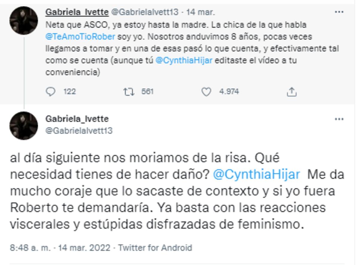 A esto, Cynthia respondió que lamentaba que eso dañara a Gabriela, sin embargo, sostiene la postura de que el Tío Rober incurrió en una violación por el hecho de seguir la relación sexual mientras ella dormía.