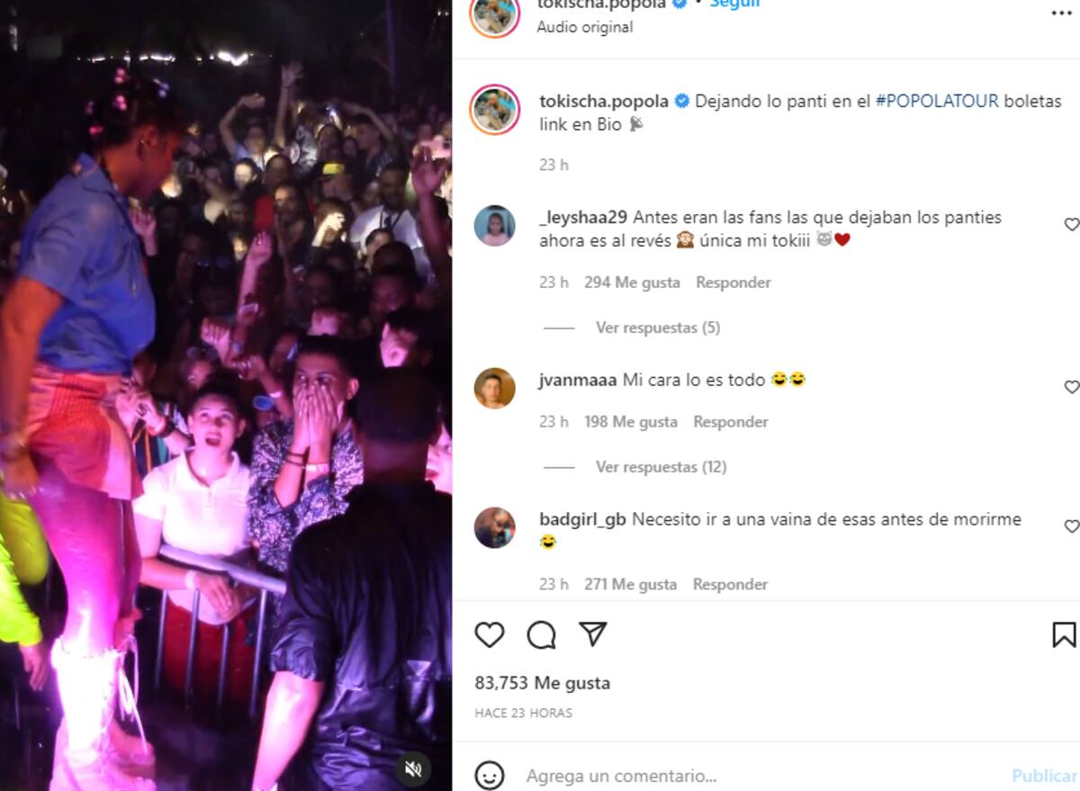 Asimismo, Tokischa también compartió el extraño suceso que vivió junto a sus fanáticos y explicó que para ella era un placer hacer este tipo de acciones para sus seguidores que siempre están de su lado. "Dejando lo pantie en el Popola Tour", escribió.