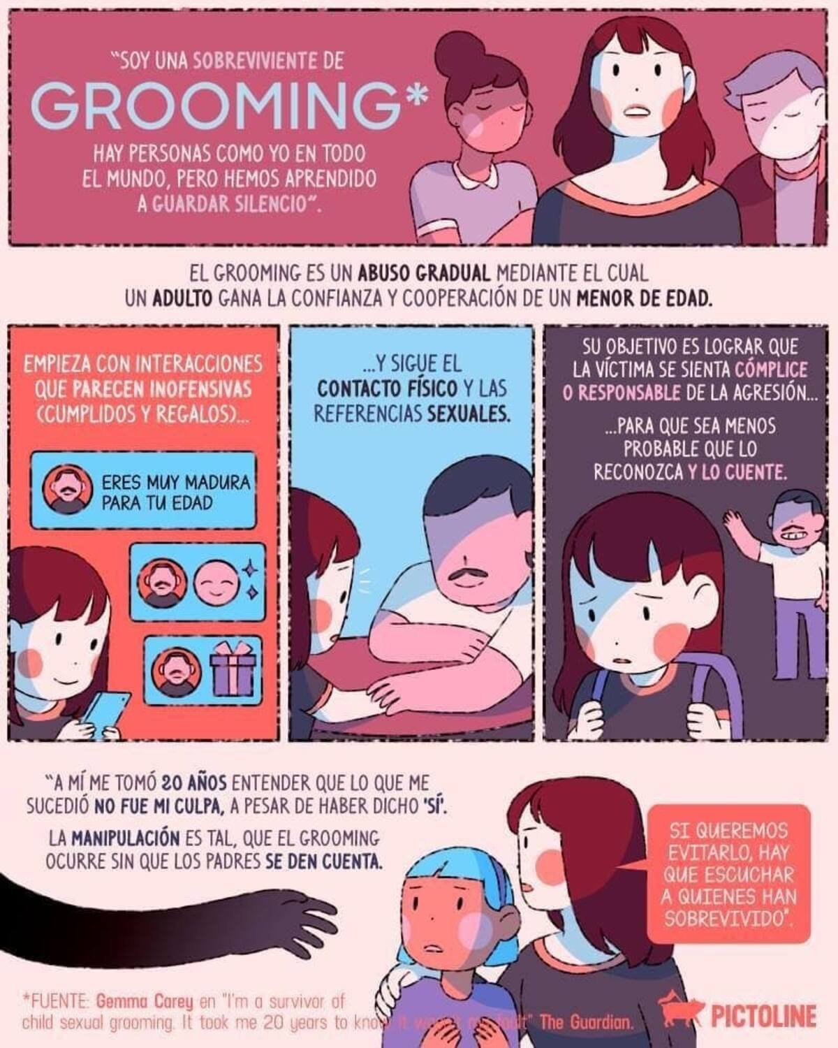 Sin embargo, detalló que existe otro tipo de acoso en línea, con el nombre de online grooming, donde el abusador envía, a través de un medio tecnológico, material sexual al niño o niña. Además, se suele hacer pasar por menor y adapta el lenguaje a la edad de la víctima. Es una violencia igual de real que la física, pero de la que no se puede huir.