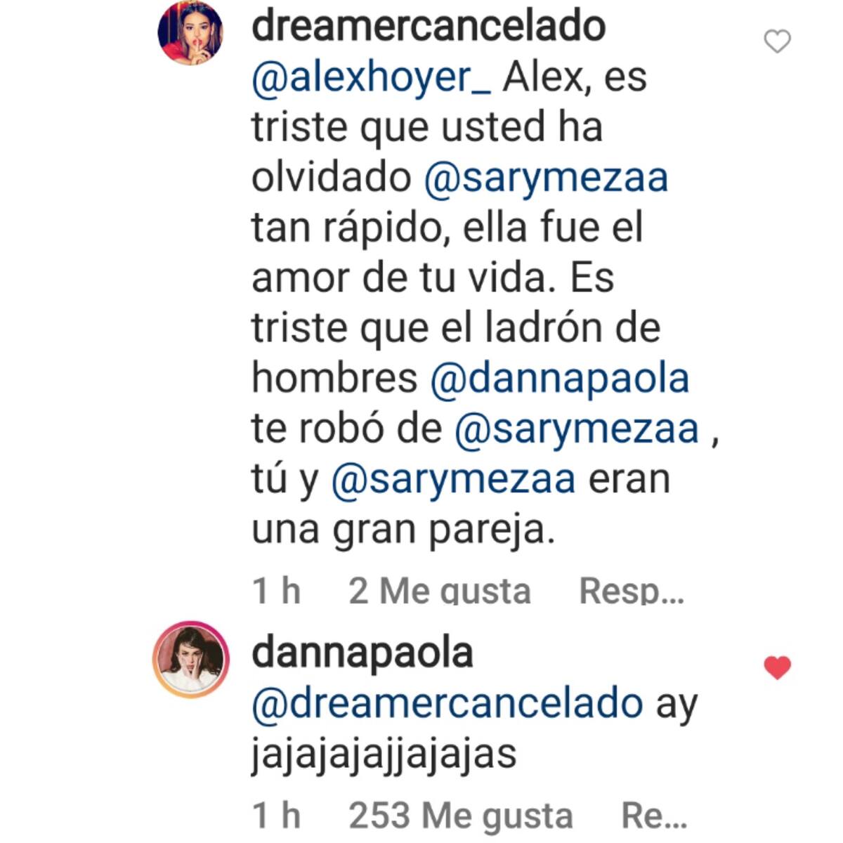 Pero no todo es 'color de rosa' pues el enojo de la intérprete de 'Oye Pablo' empezó por un comentario de instagram en el perfil del influencer por parte de la cuenta 'Dreamer cancelado' que decía: "@alexhoyer_ Alex, es triste que usted ha olvidado @sarymezaa tan rápido, ella fue el amor de tu vida. Es triste que el ladrón de hombres @dannapaola te robó de @sarymezaa, tu y @sarymezaa eran una gran pareja".