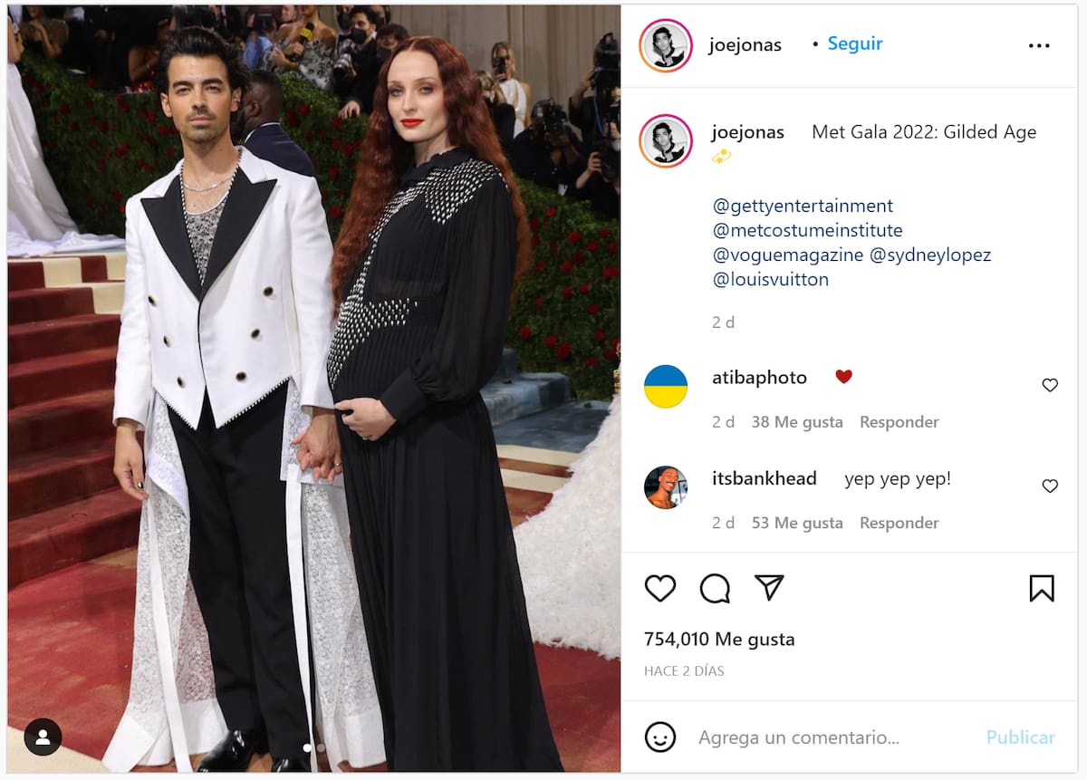 Sophie y Joe fueron la pareja más romántica de la Met Gala 2022, pues además de derrochar elegancia, lo que más cautivó a sus millones de seguidores fue la forma en la que la actriz presumió su pancita de embarazo ante las cámaras de todo el mundo.